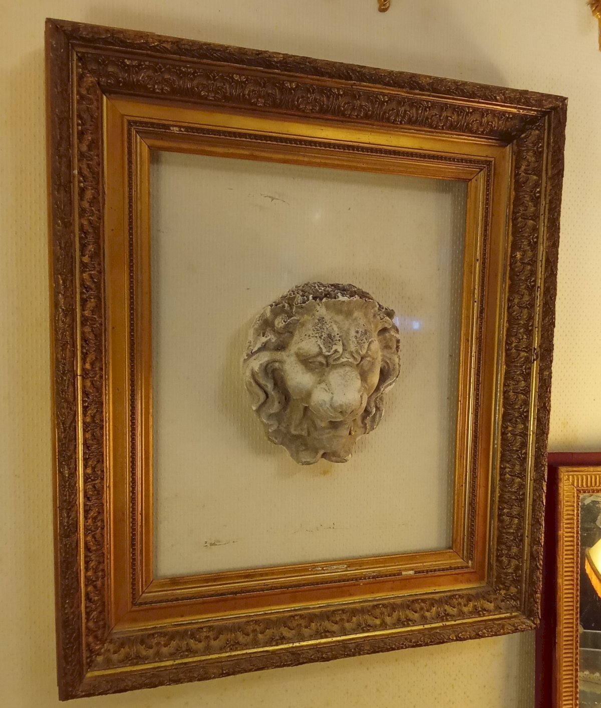 Ancien grand Cadre Doré Tête Lion Pierre Sur Plexiglas Composition Pièce Unique