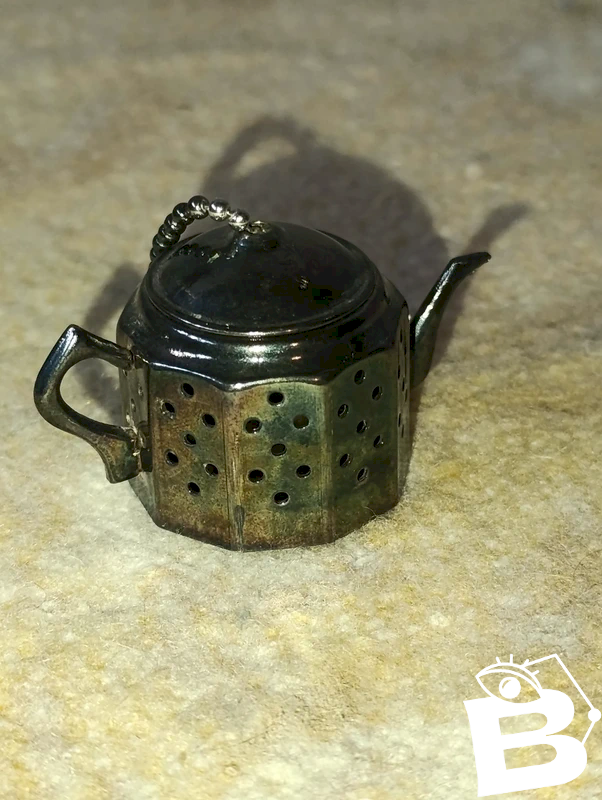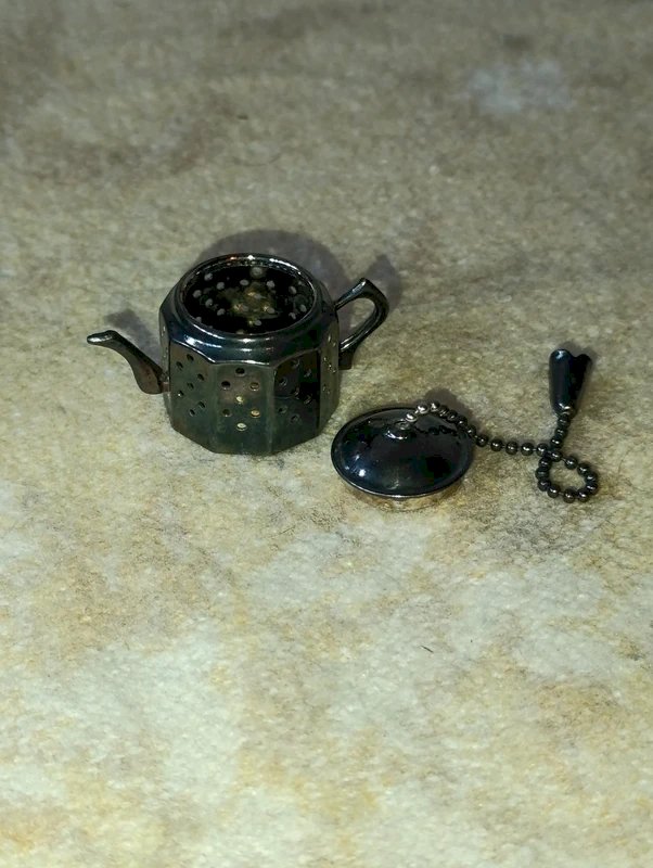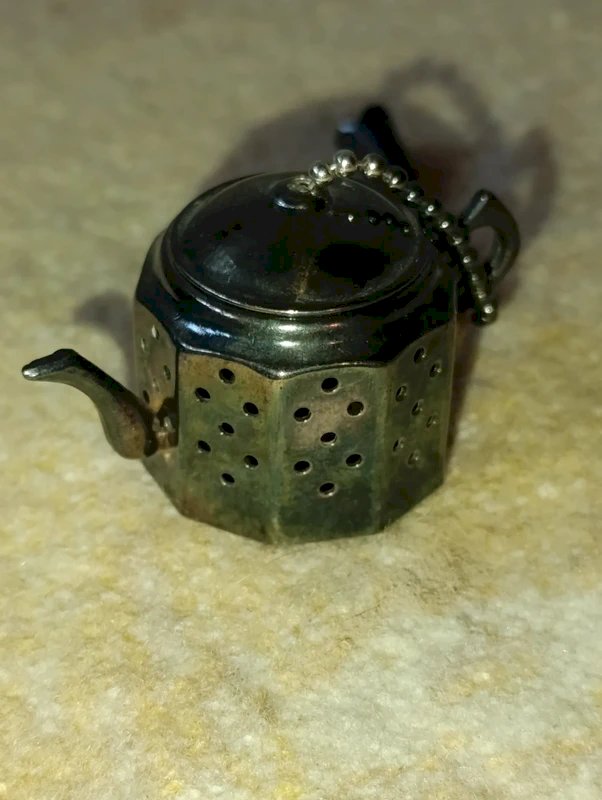 ancien infuseur a the anglais en forme de théière en bon etat patine du temps hauteur 3.5cm