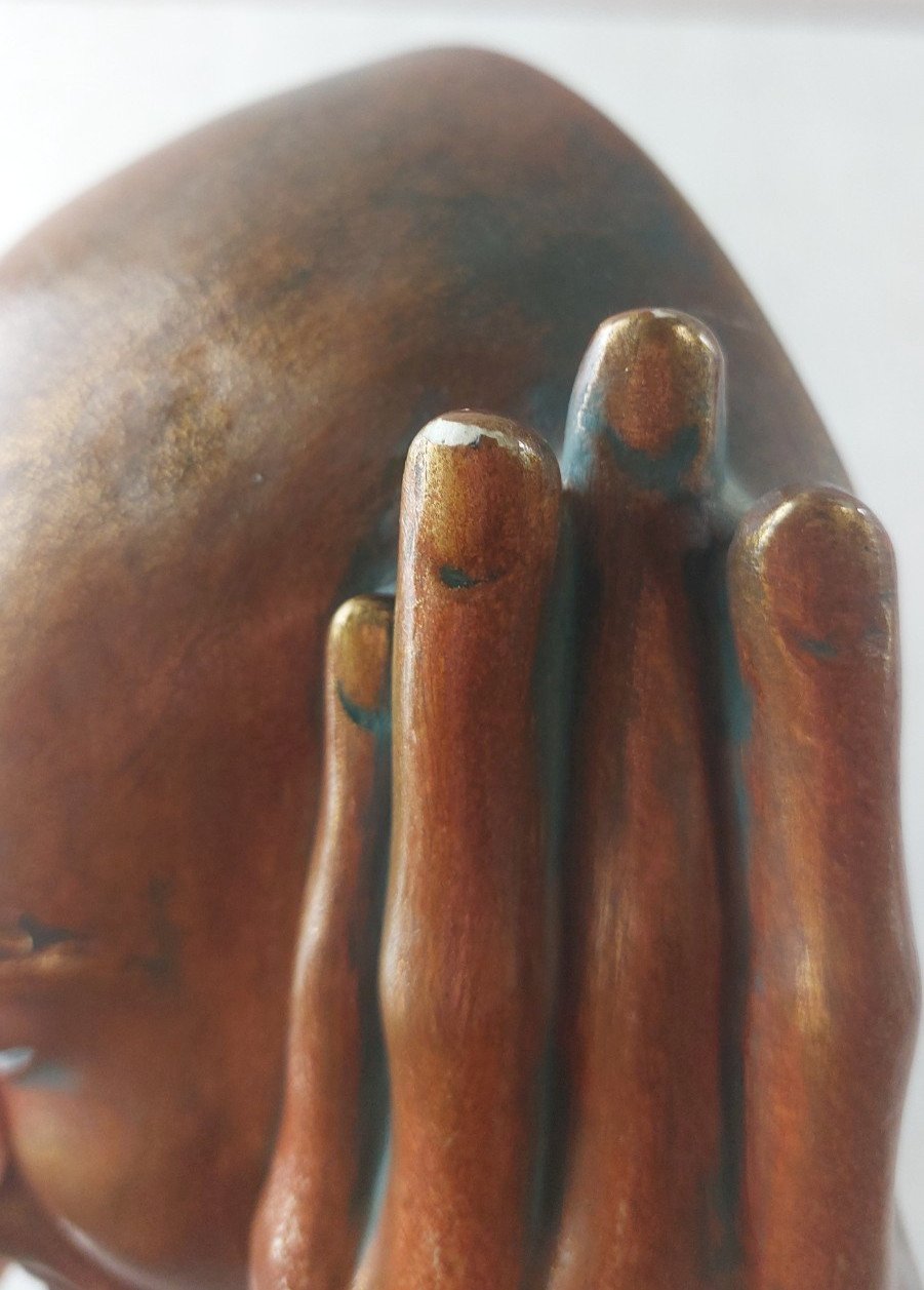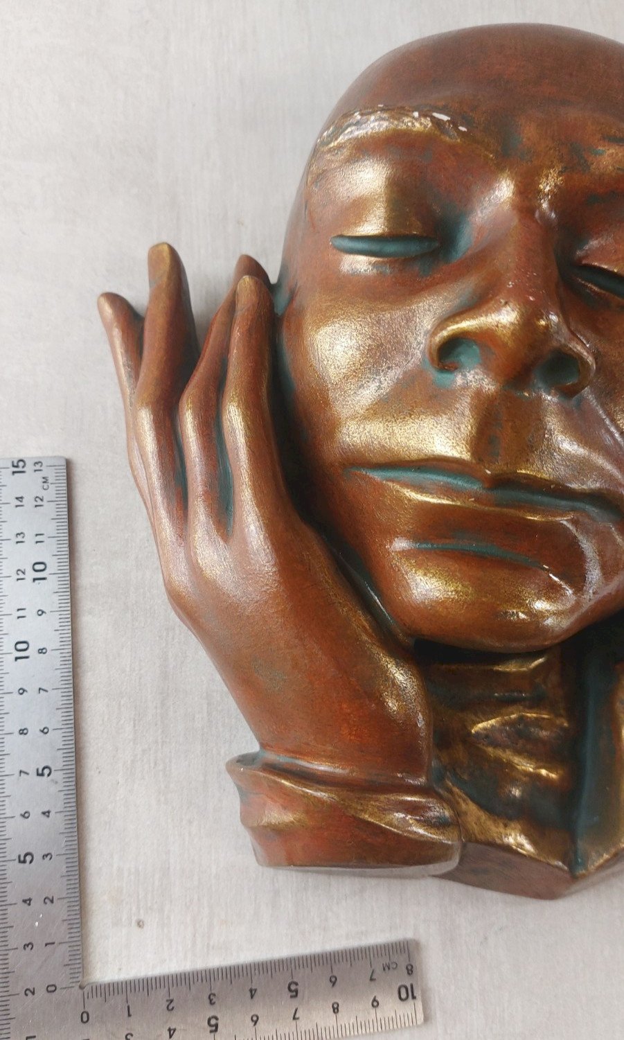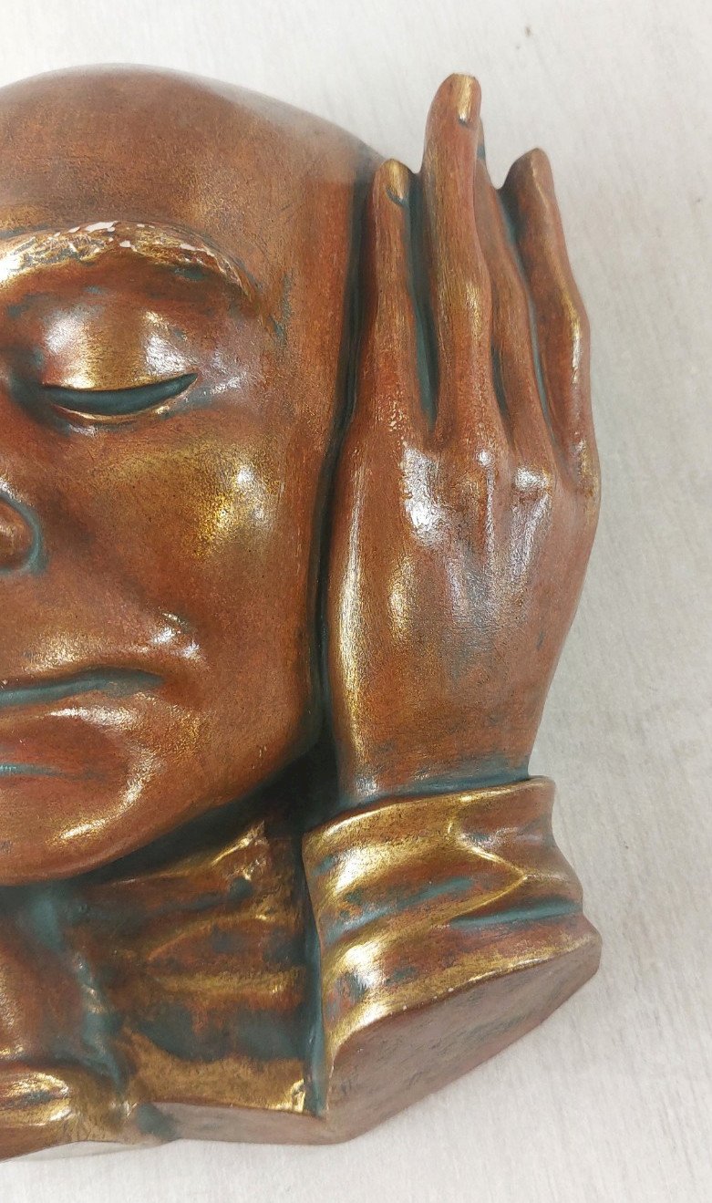 Ancien masque mural / Wandmaske, Achatit en bon état, pas de fêle, un petit éclat sur un doigt, quelques manques de peinture sur les sourcils  signé Achatit, Handarbeit Made in Germany dimensions 24,5 cm X 21 cm v oir photos  Consultez mes autres objets  !  réduction des frais de port en cas d'achat groupé Pays d'origine:Allemagne Marque:Achatit