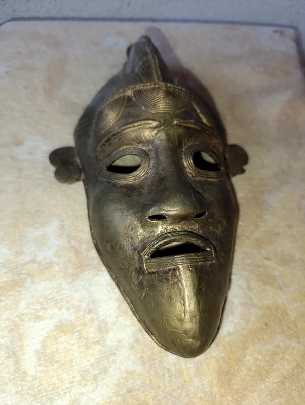 ancien Masque tribal artisanal en Bronze d'origine africain en bon etat sans doute milieu 20eme siecle usures et patines normales du temps dimension 27cm