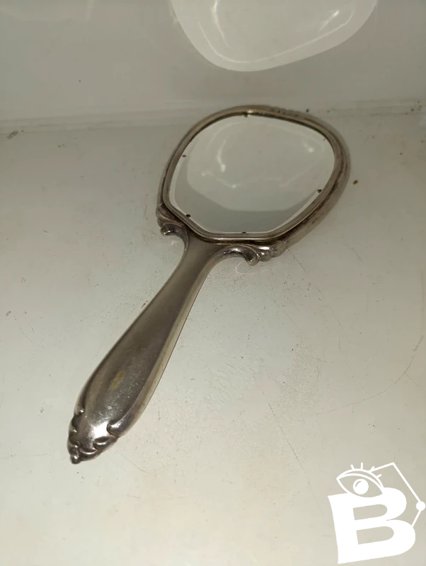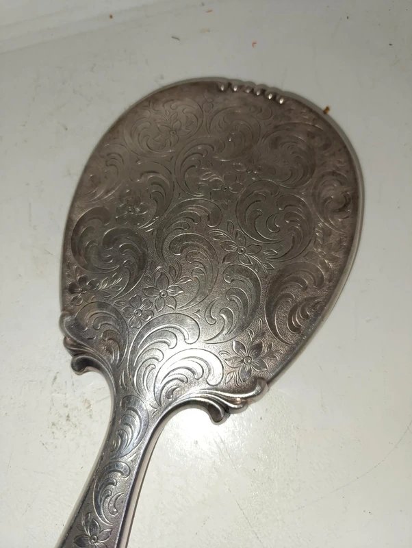 ancien miroir à main en metal argente arriere travaillé en bon etat Argenté