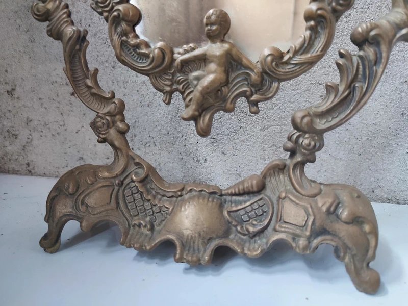 ancien miroir en bronze a decor de cherubin en bon etat un peu d'usures du miroir un peu pique par endroit et l'arriere les deux vis de pivot ont ete changés hauteur 33cm