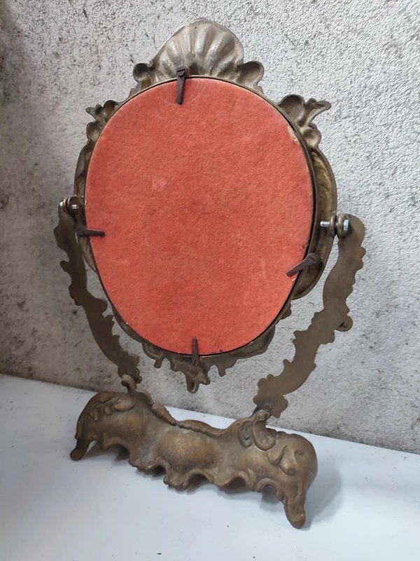 ancien miroir de table art deco en bronze a decor de fleur et doiseau en etat correct