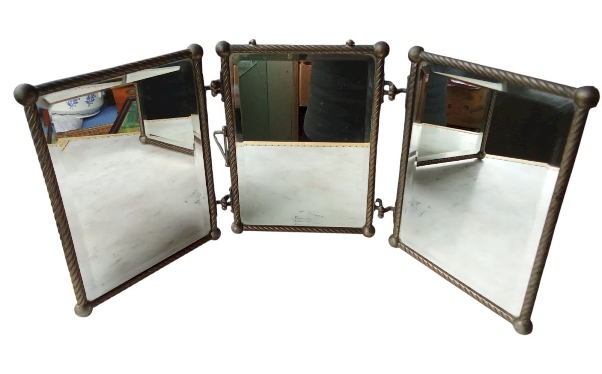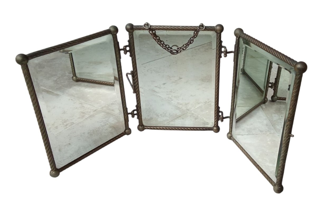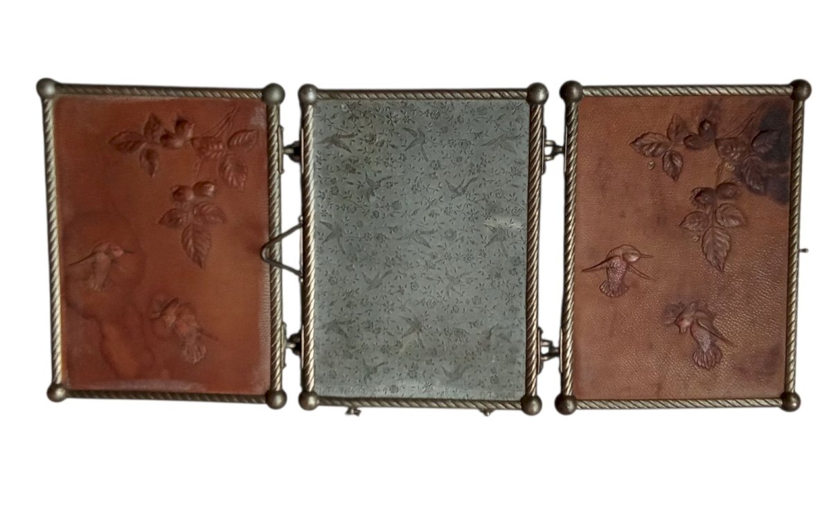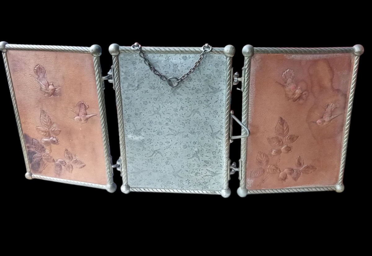 Ancien miroir triptyque Art Nouveau barbier Décor Cuir Oiseau Coccinelle