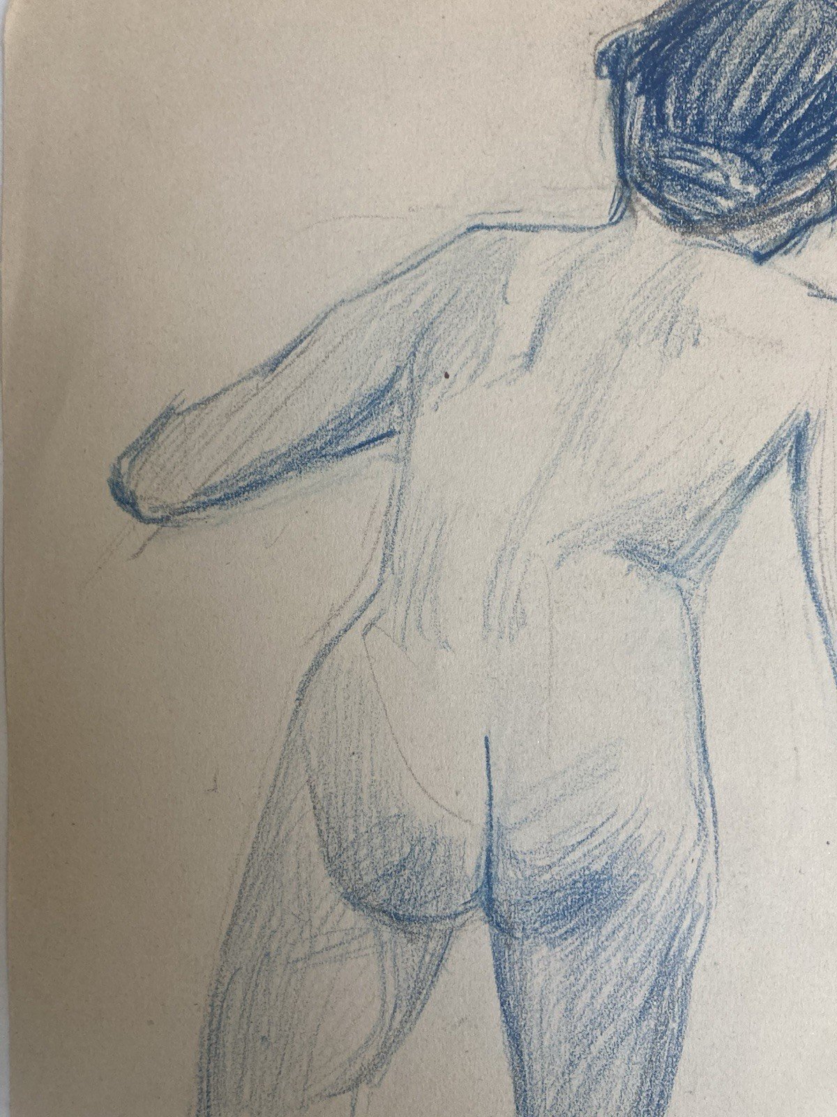 Ancien Nu Dessin Crayon Sur Papier Femme 1910 Erotique Art Déco Nue Bleu Dos