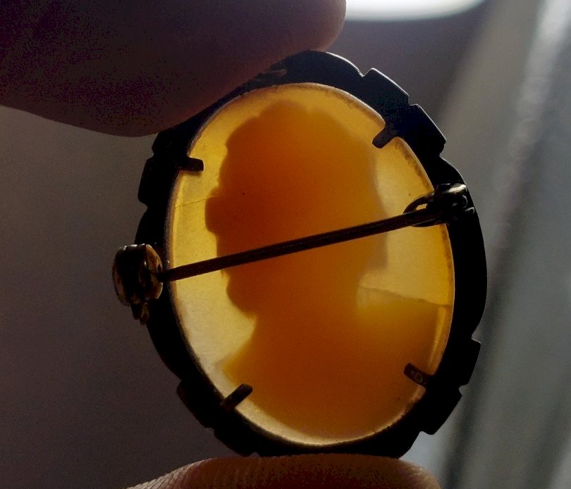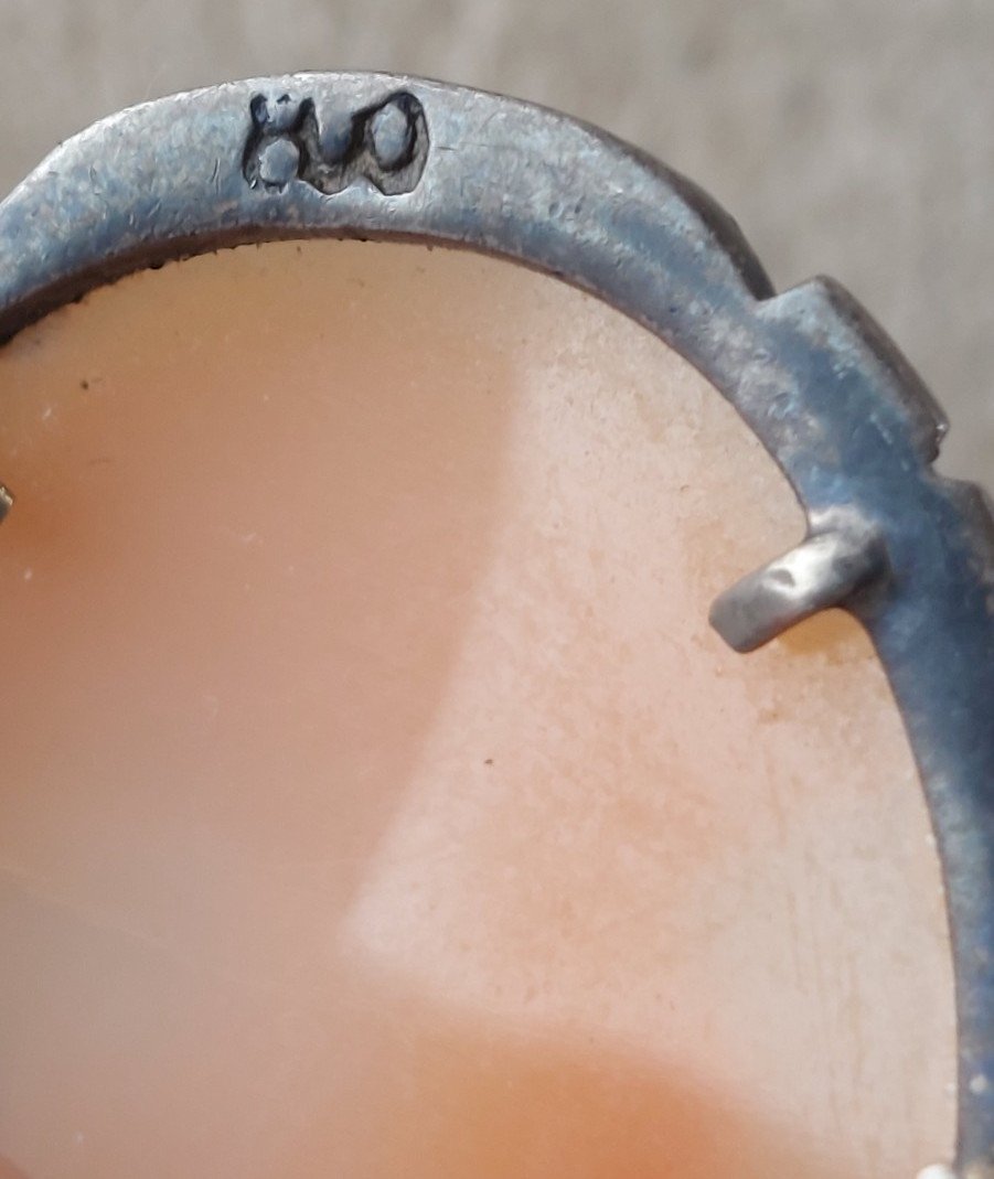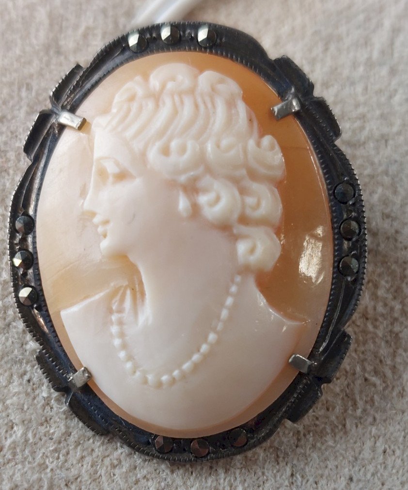 Ancien pendentif / broche camée, décor marcassite, en argent ^