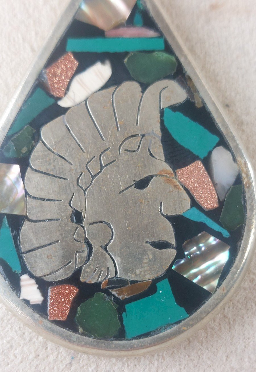 Ancien pendentif, calendrier Aztèque / Maya, forme goutte, en argent massif incrustation pierres et nacre en bon état marquée Sterling 925 dimensions 5,8 cm X 3,9 cm poids total 36,30 gr voir photos Consultez mes autres objets ! réduction des frais de port en cas d'achat groupé État:OccasionObjet ayant été porté. les éventuelles imperfections. Pureté métal:925 parties pour 1000 Métal de base:Argent sterling, 925 parties pour 1000 Métal:Argent massif