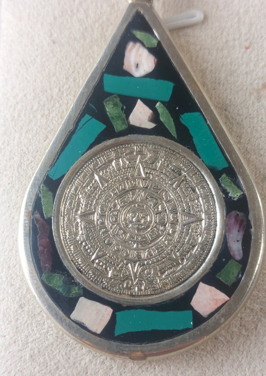 Ancien pendentif, calendrier Aztèque / Maya, forme goutte, en argent massif