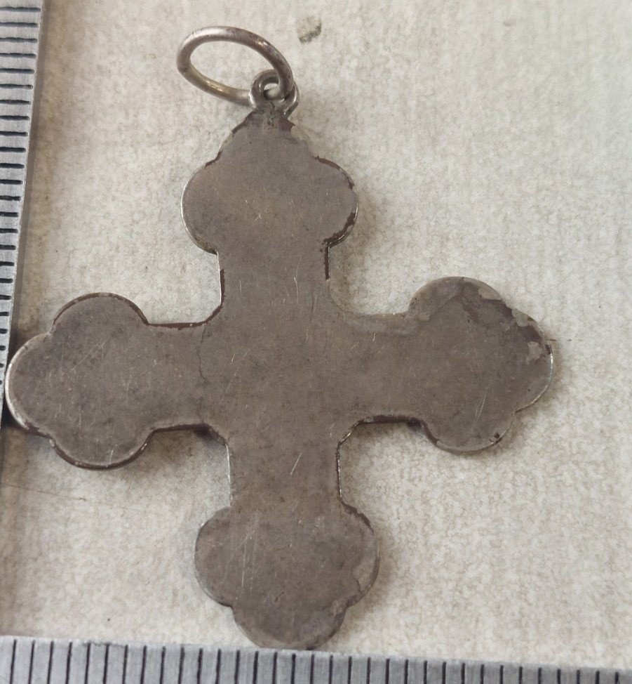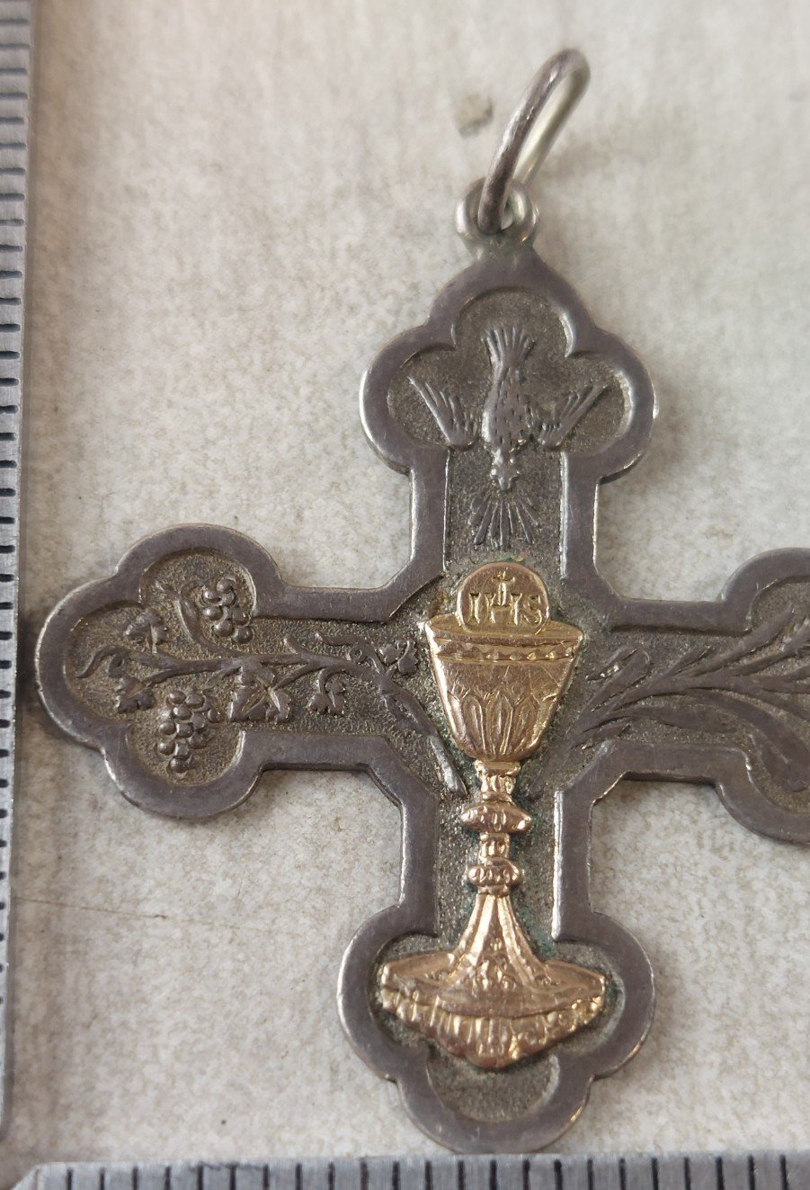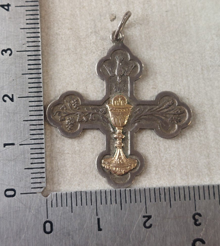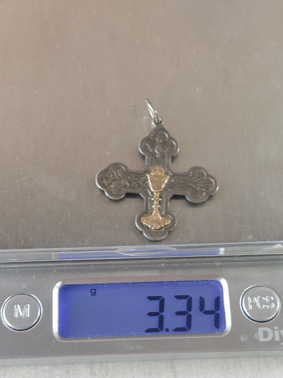 Ancien pendentif religieux / médaillon, décor calice, communion, en argent