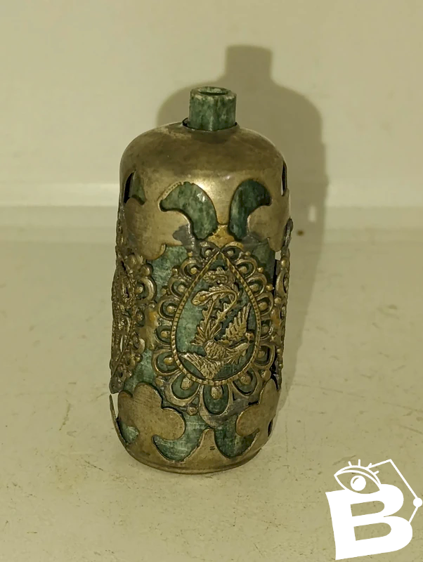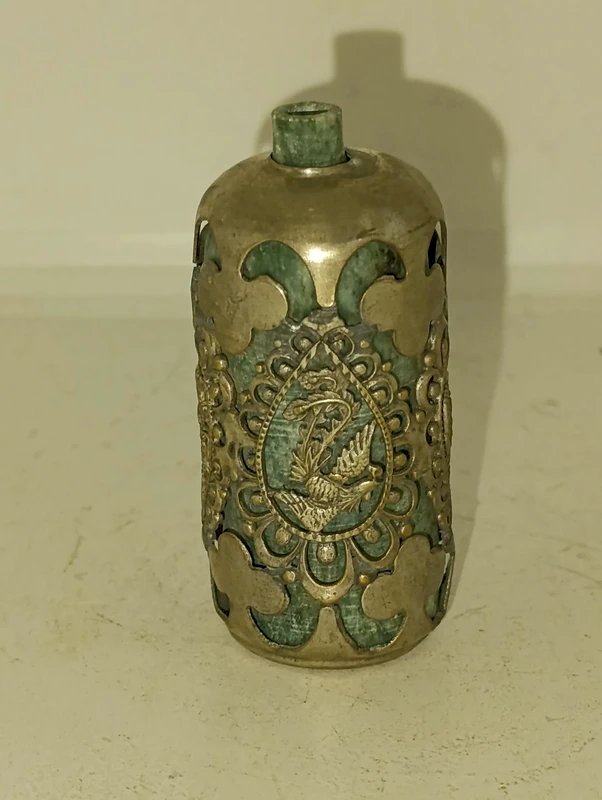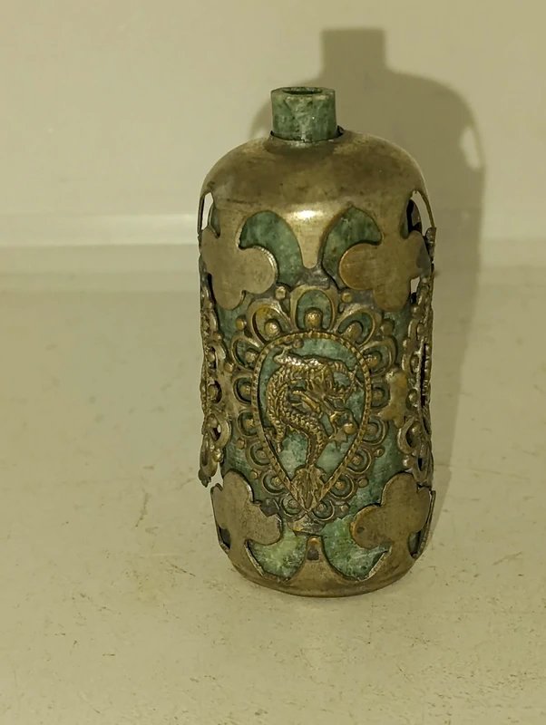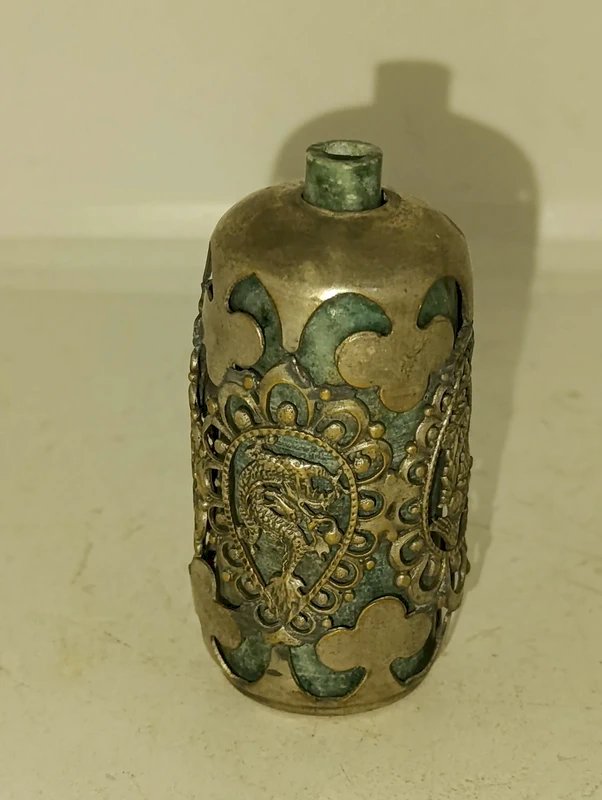 ancien petit flacon chinois en metal à decor de dragon en bon etat general interieur en serpentine ou jade quelques petites parties fines dessoudées mais ne gene pas (voir photos) poinçon en dessous hauteur 6.8cm