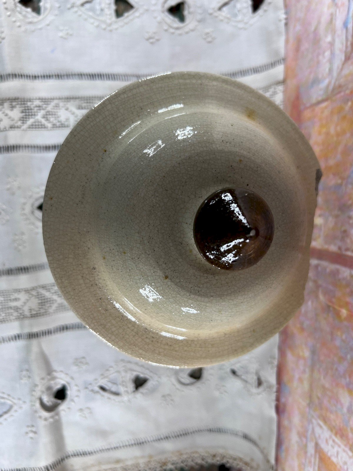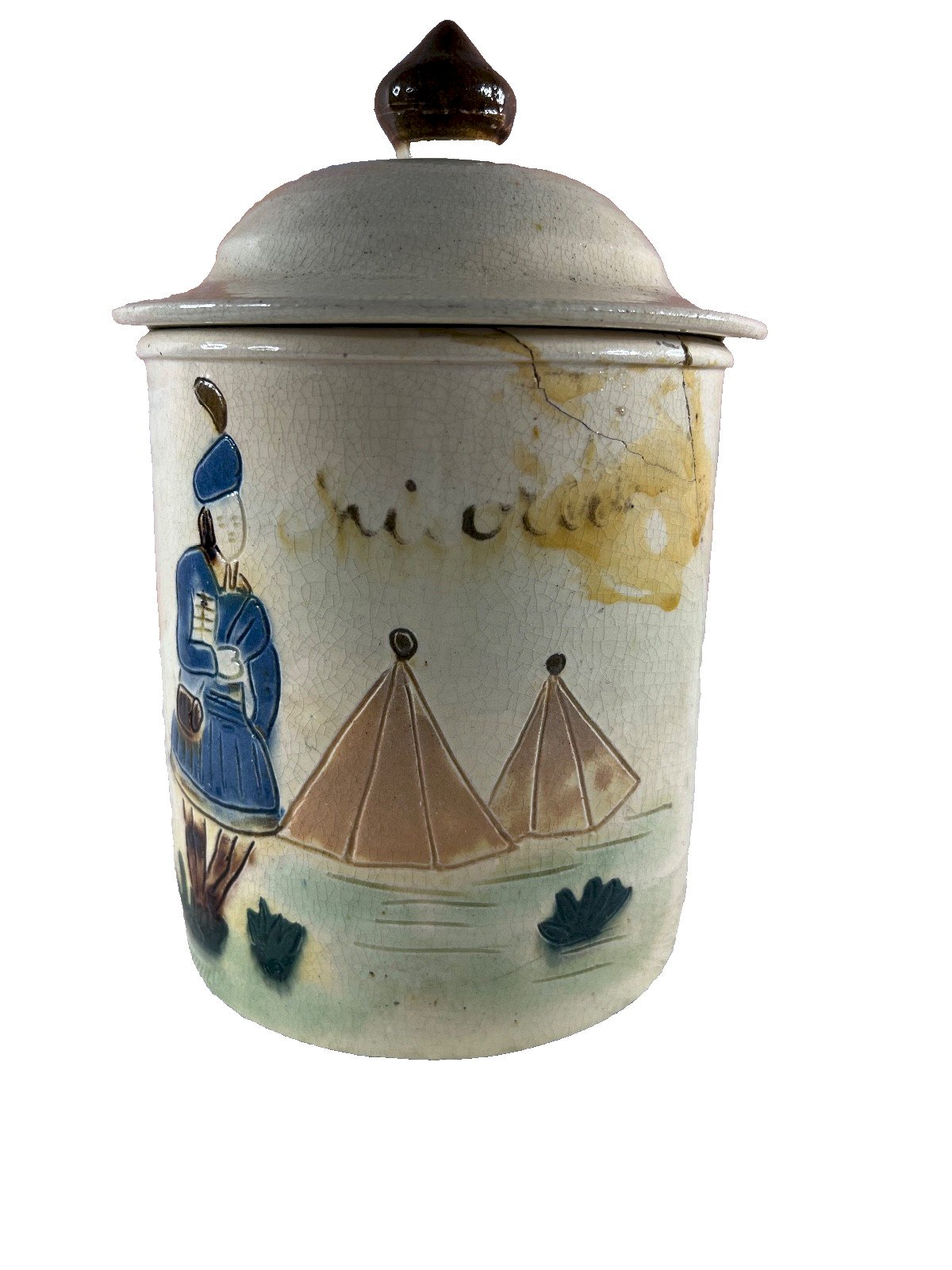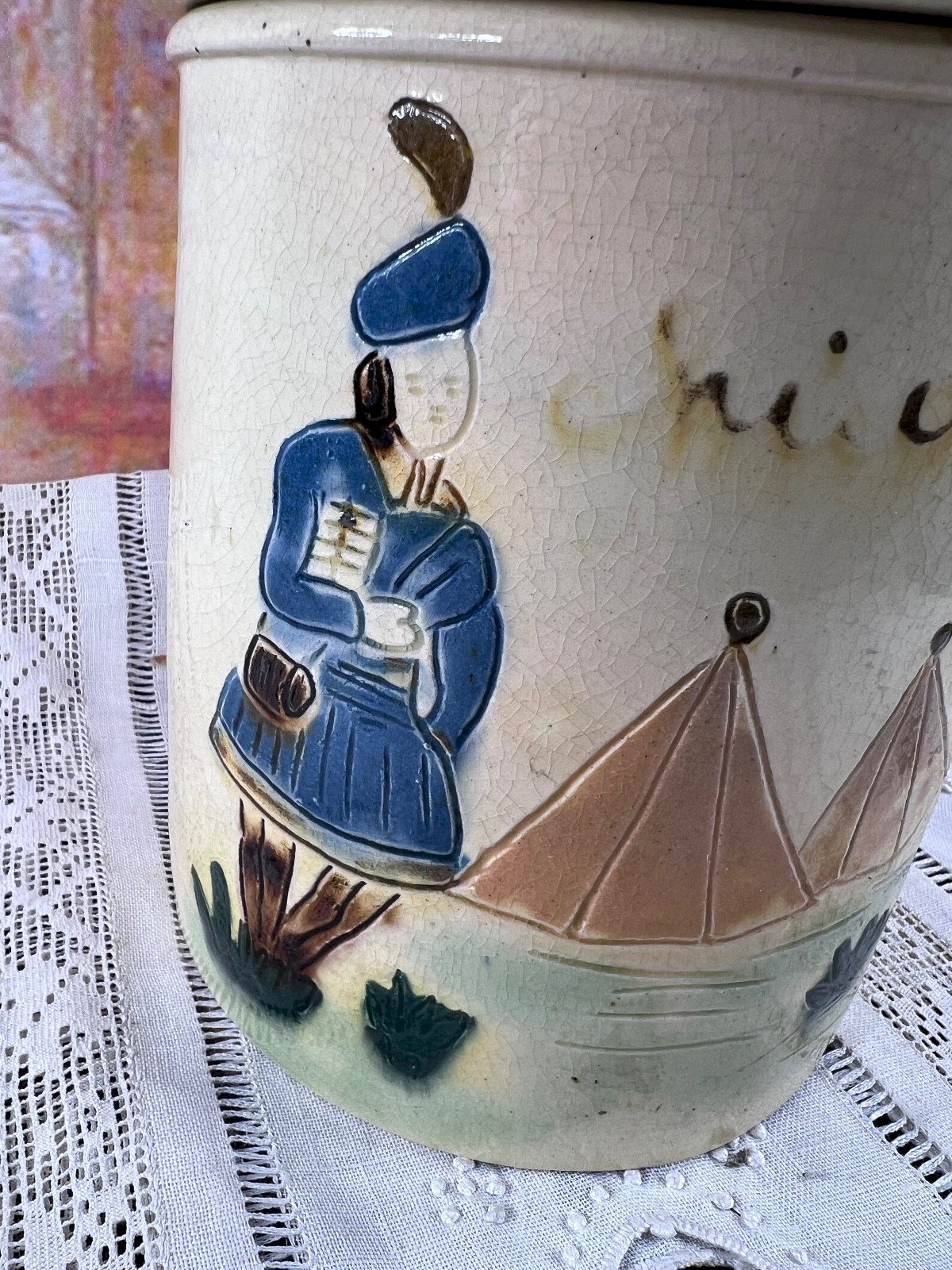 Ancien pot à chicorée en faïence française , datant de la fin du XIXᵉ siècle / début XXᵉ siècle , typique des pots d’épicerie et de cuisine d’autrefois. Ce type de contenant accompagnait le quotidien : le geste du matin, la boisson chaude, la lenteur des cuisines anciennes. Aujourd’hui, il conserve cette présence douce et authentique qui fait tout le charme des objets vécus. Caractéristiques Faïence à glaçure craquelée ancienne Décor en relief polychrome représentant une scène naïve Inscription peinte « Chicorée » Belle patine du temps, nuances naturelles de l’émail Dimensions Hauteur : 20 cm Diamètre : 14 cm ⚠️ État Manques et éclats visibles sur le couvercle élément recollé sur le pot Traces d’usage et marques du temps conformes à l’âge de la pièce ? Ces défauts sont anciens et authentiques . Ils n’altèrent ni la solidité générale ni l’impact décoratif, et témoignent de son histoire. Usage actuel Idéal en objet décoratif : Cuisine de campagne Étagère rustique Décor wabi-sabi, shabby chic ou maison de famille Authenticité:Original Type:Pot / Bocal Origine:France Pays d'origine:France Sous-type:Pot d’épicerie ancien Matière:Faïence Style:Rustique / Campagne / Shabby chic