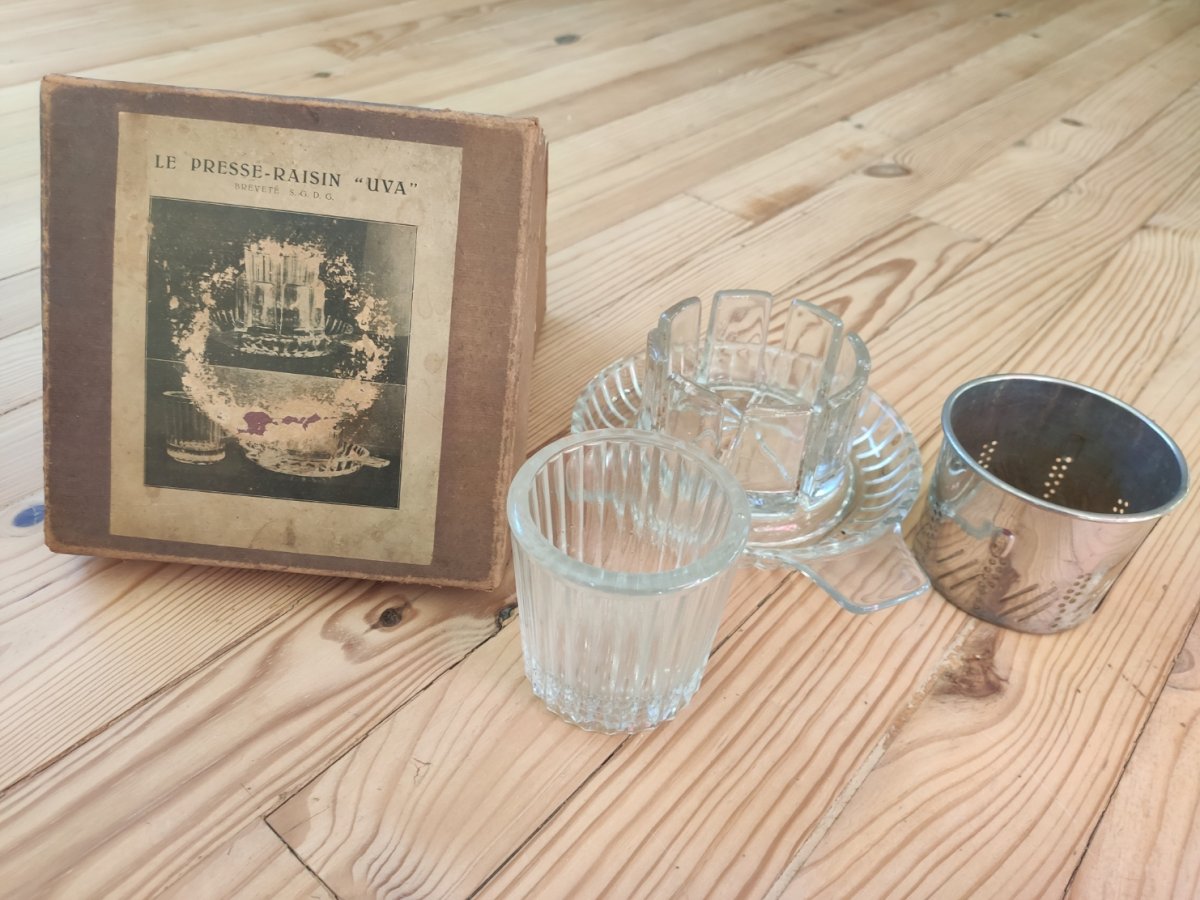 Ancien Presse-Raisin "UVA" en verre et métal avec boîte d'origine - Vintage