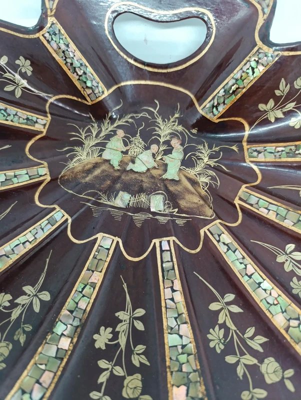 ancien ramasse miettes asiatique avec peigne en bon etat bien travaillé à note fond un peu ecaillé normal du a son age, un petit manque en dessous dans un coin et peigne use en bout (voir photos) dimension corbeille 31X25.5cm et du peigne 33cm