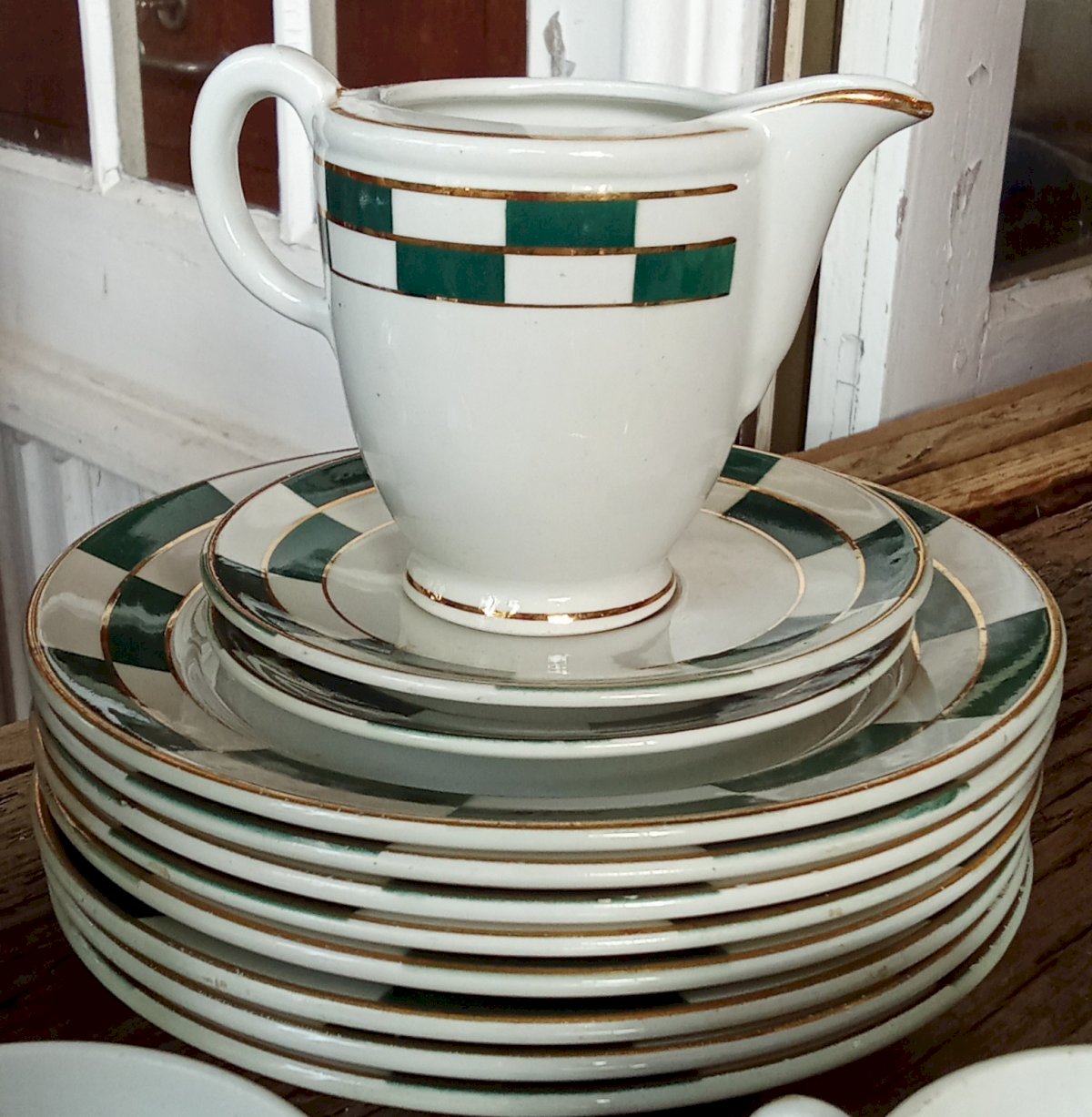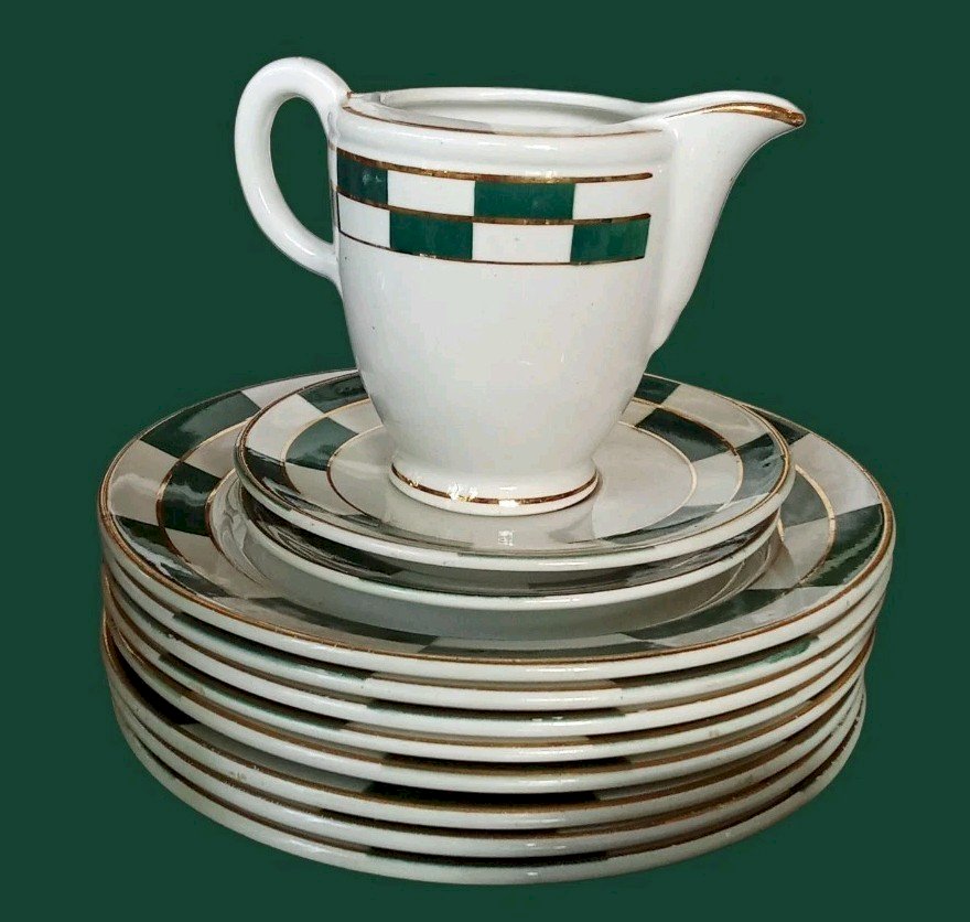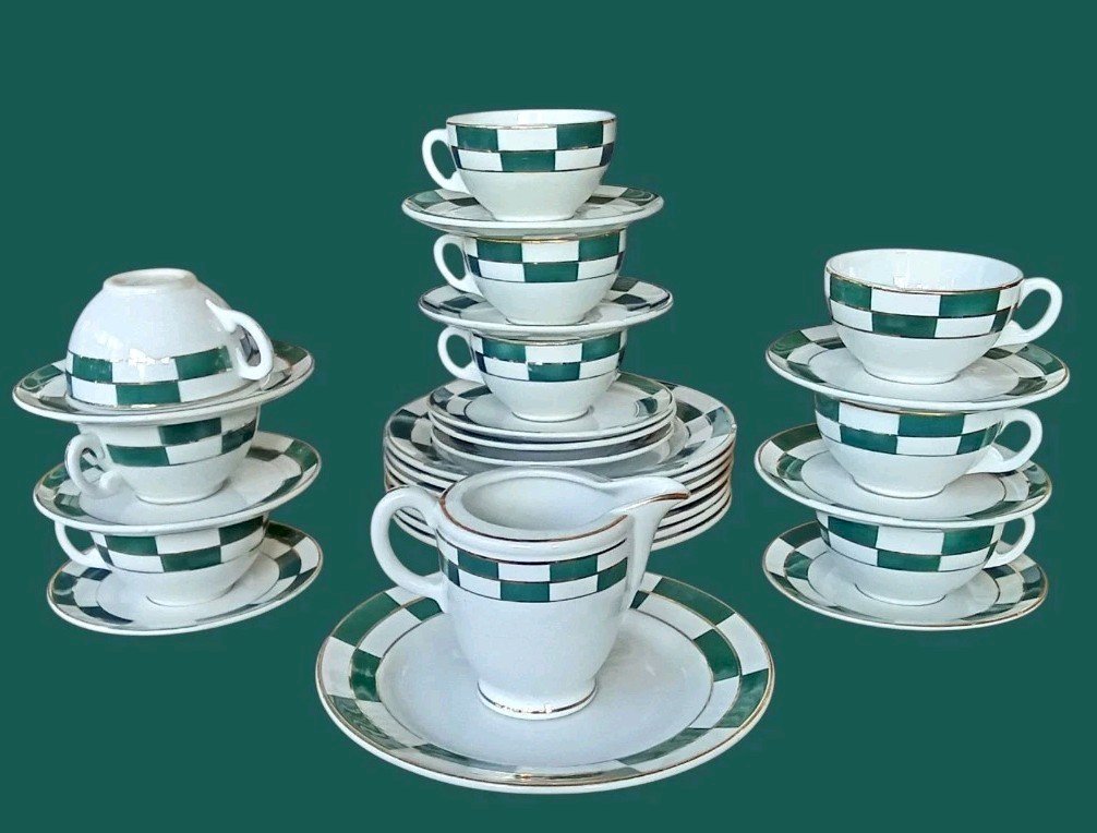Ancien Service à Café KG Lunéville France Joli décor à carreaux vert et bordures dorées Art de la table ancien Bon état général 9 tasses Diamètre buvant 8.3 cm (2 tasses avec cheveu,1 avec pt éclat ) 11 soucoupes Diamètre 13 cm 8 assiettes Diamètre 18.5 cm (1 avec pt éclat) 1 pot à lait Hauteur 9 cm Longueur avec bec et anse 12.4 cm
