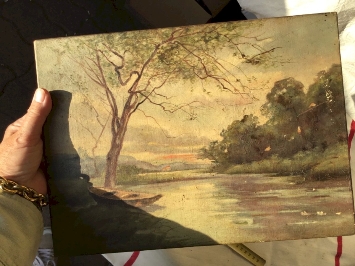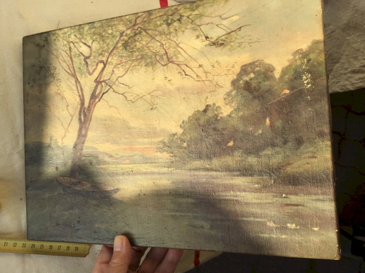 ANCIEN TABLEAU HUILE S/toile rivière barque VILLAGE 33x24