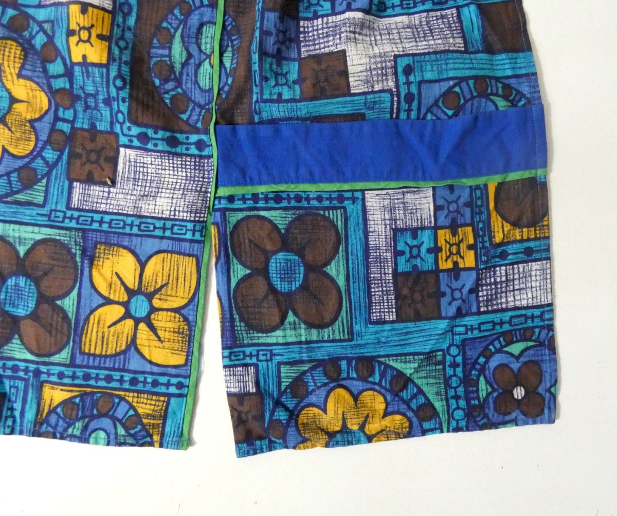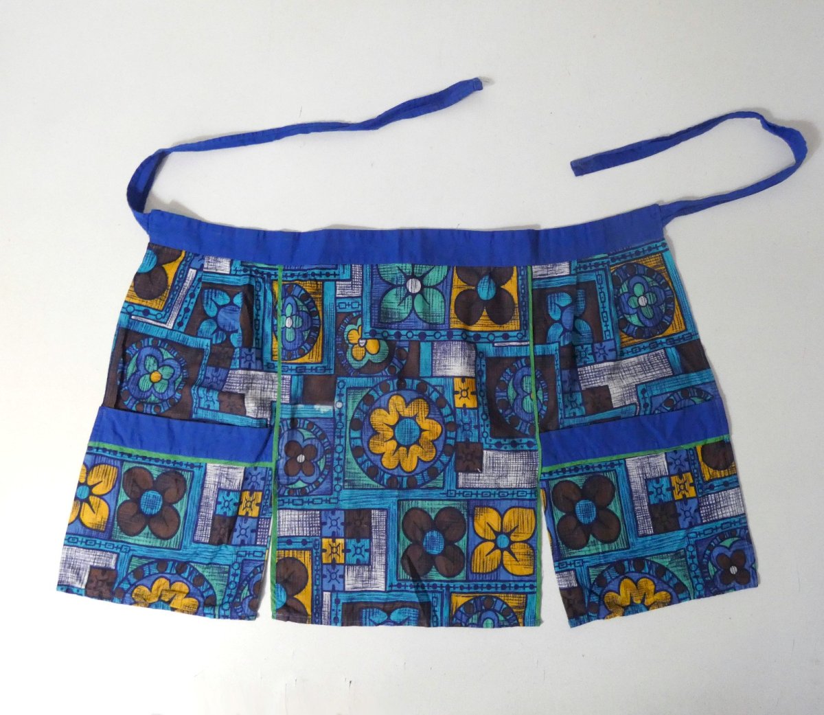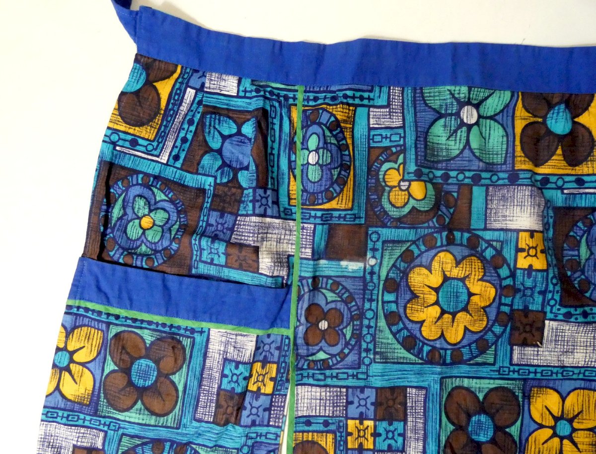 Ancien tablier des années 70. 100 % coton. Longueur: 40,5 cm. Largeur de la bavette: 54 cm Largeur totale, avec les nouettes: 146 cm. Belle qualité. Joli tablier aux couleurs vives, avec deux poches latérales. En très bon état, malgré une tache discrète de décoloration (perdue dans les motifs).