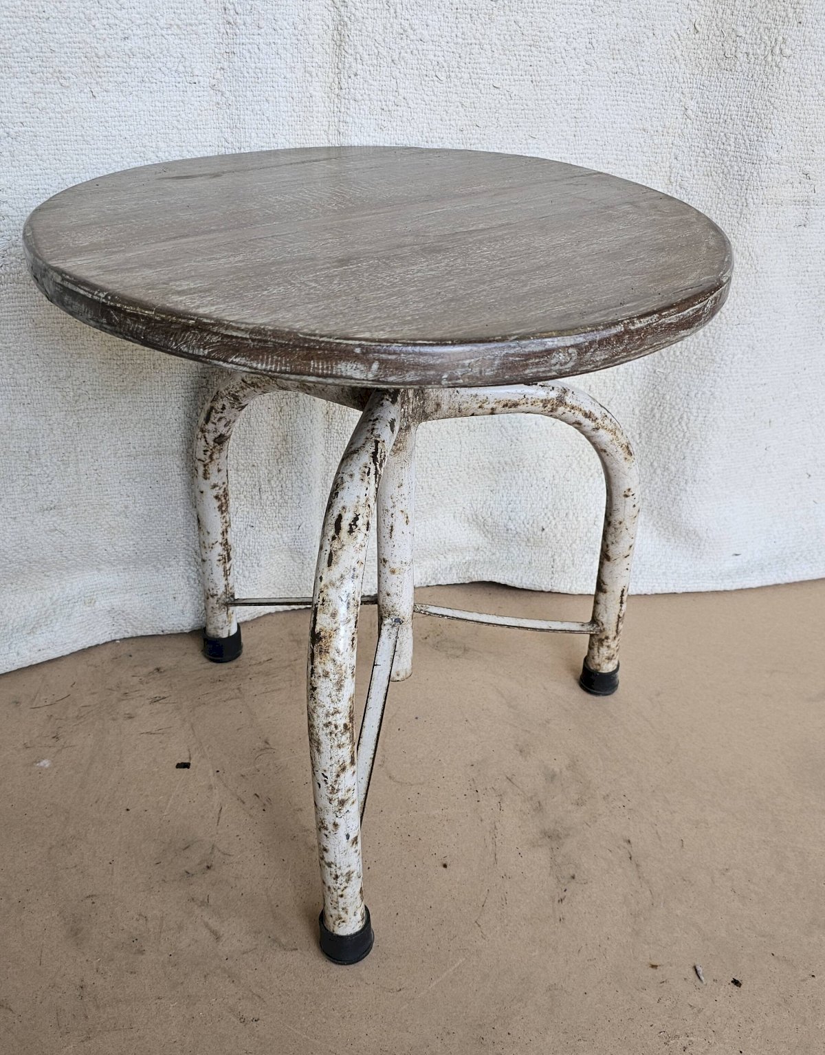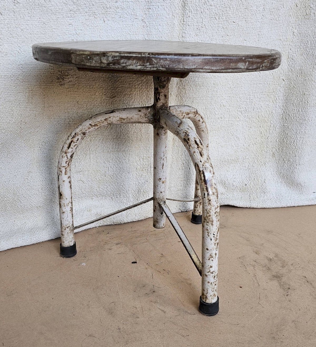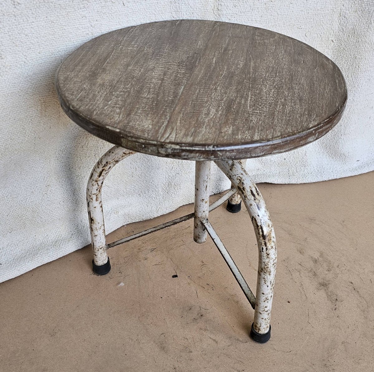 Ancien tabouret datelier en teck + fer forgé Industriel Métal