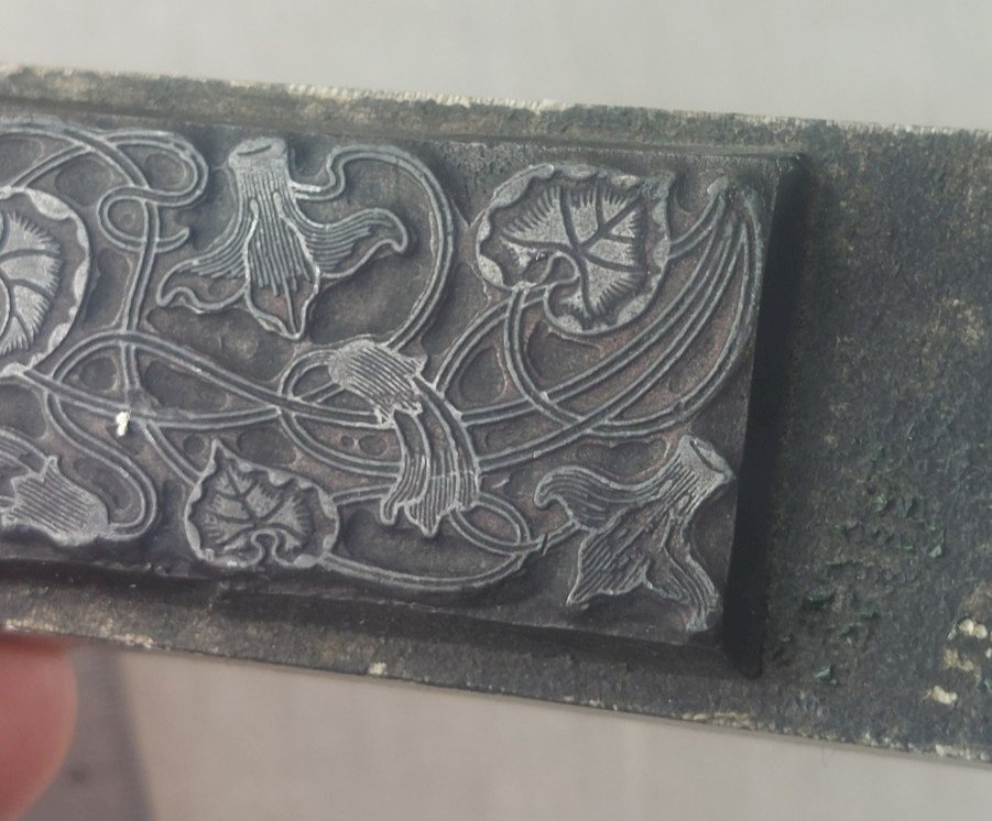 Ancien tampon frise, décor feuilles, en métal en bon état dimensions totales 14,5 cm X 3,7 cm poids 330 gr v oir photos  Consultez mes autres objets  !  réduction des frais de port en cas d'achat groupé Authenticité:Original Type:Objet de métier