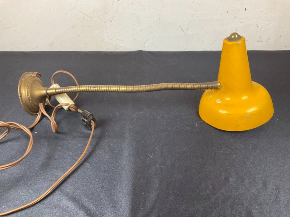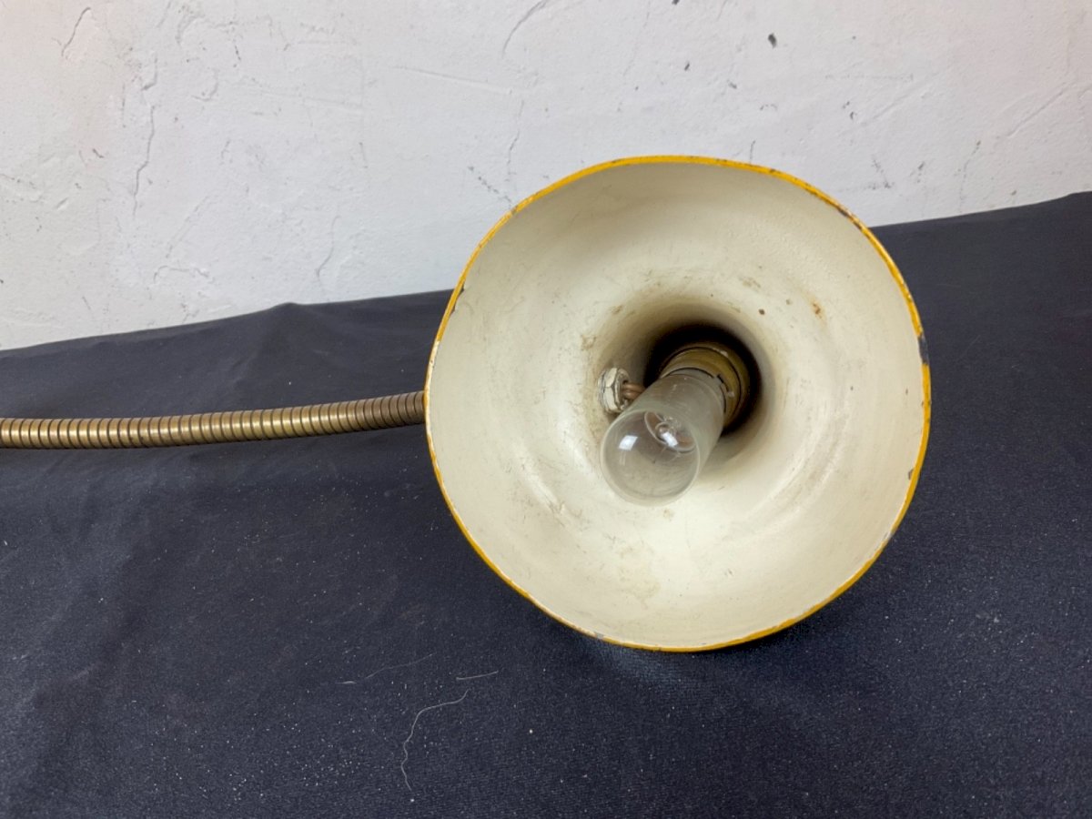 Ancienne applique de bureau articulée flexible vintage industriel Longueur : 42 cm Type:Lampe de table Période:Design du XXème Sous-type:Bureau Couleur dominante:Jaune Style:1970 Matière:tole Type d'éclairage:Standard Caractéristiques:A baïonnette