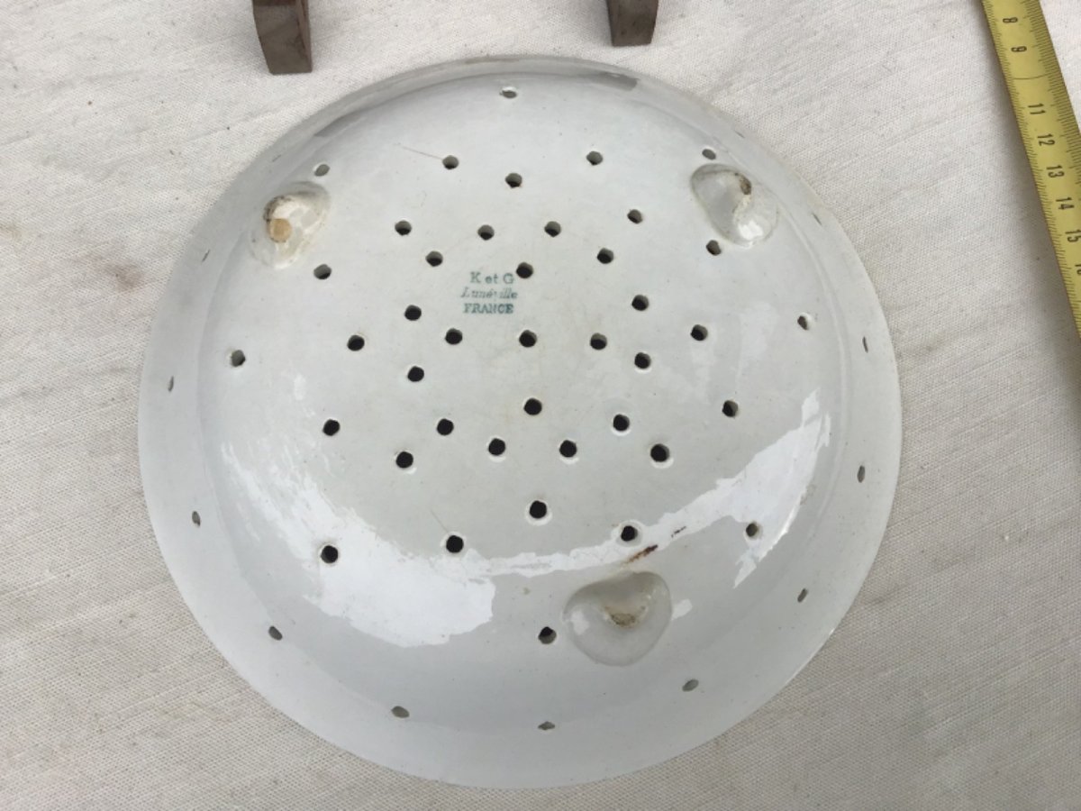 ANCIENNE ASSIETTE EGOUTTOIR FAISELLE FAIENCE BLANCHE fromage blanc fraises K.G.