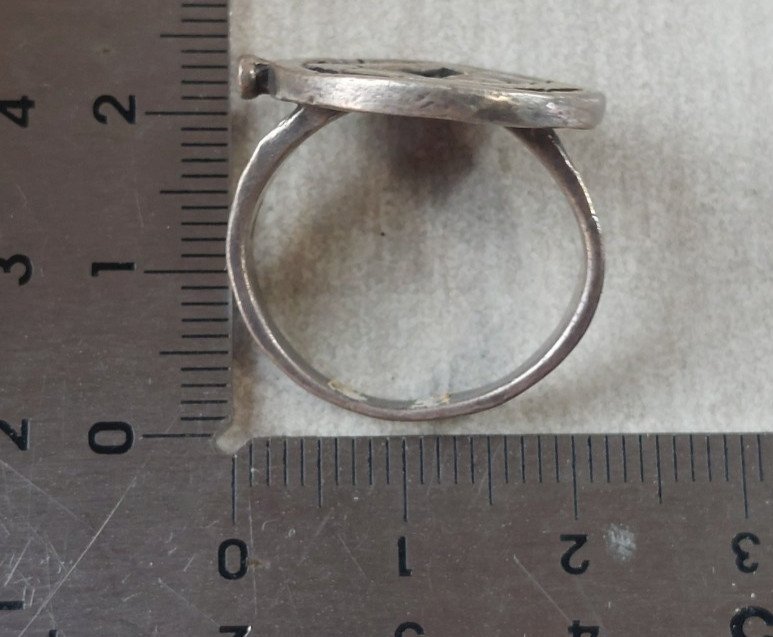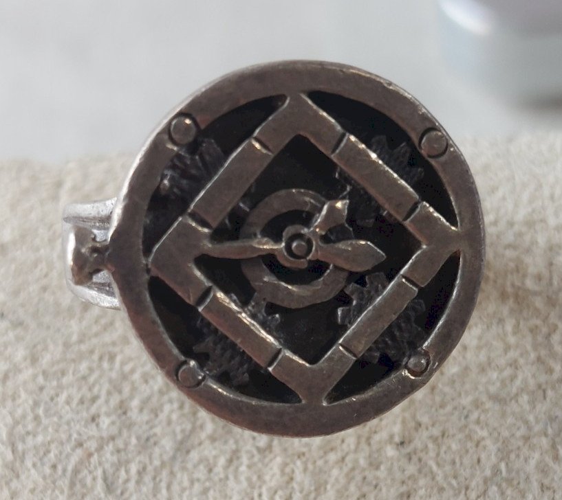 Ancienne bague, décor montre, en argent massif ^