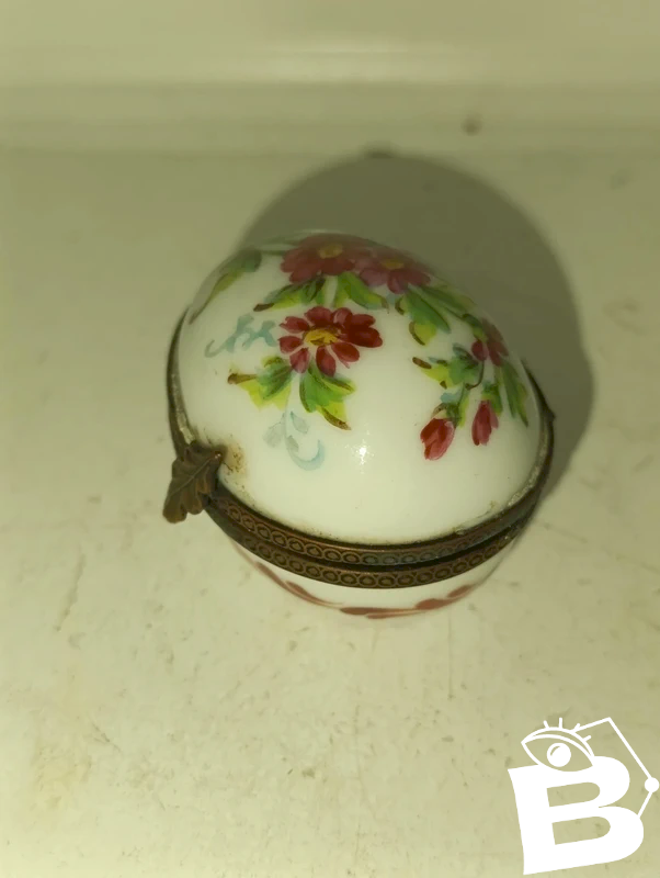 ancienne boite à bijoux en forme d'oeuf peint decor floral en bon etat signature à reconnaitre decor peint à l'exterieur et à l'interieur un peu d'usures normales du temps dimension 5X4cm hauteur 4cm...