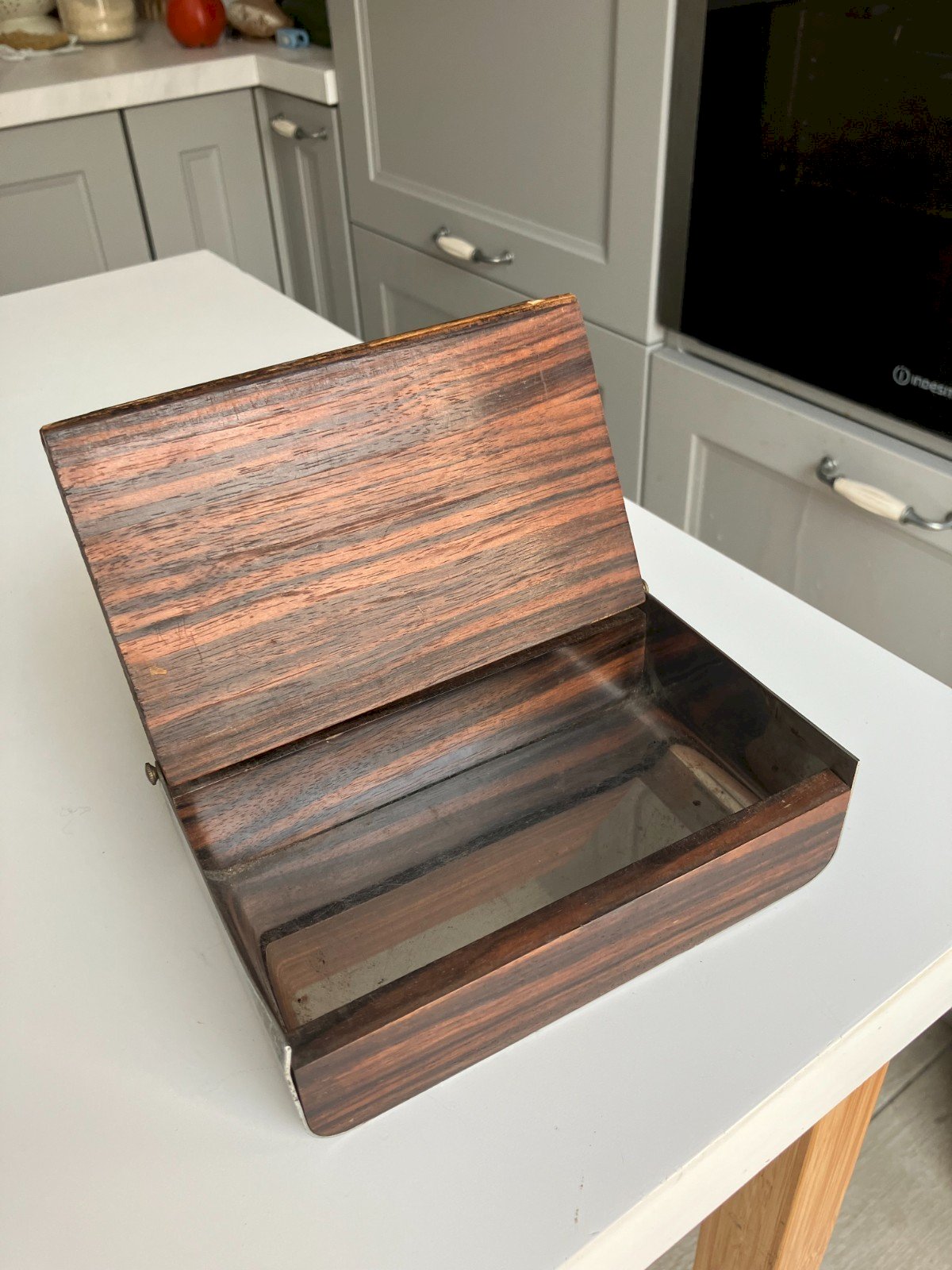 ancienne boite a cigarettes palissandre massif et laiton argente art deco ?