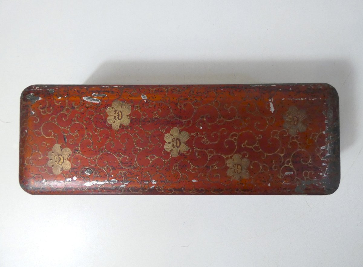 Ancienne boite à gants, en bois laqué. Fin XIXème, début XXème. Dimensions: 30,5 cm x 10,5 cm. Hauteur: 8 cm. Coffret rectangulaire allongé en bois, laqué rouge-brun, orné d’un décor floral doré, appliqué à la main. Les motifs en volutes évoquent les lignes végétales typiques de l’Art Nouveau. L’usage de la dorure et le style des fleurs rappellent les arts décoratifs d'inspiration orientale de cette époque. Le coffret présente des traces d'usage et de vieillissement homogènes, une très belle patine cohérente à une centaine d'années. La clé est manquante. Les charnières sont impeccables, ainsi que les assemblages: pas de jeu et parfait alignement du contenant avec son couvercle. Style:art nouveau