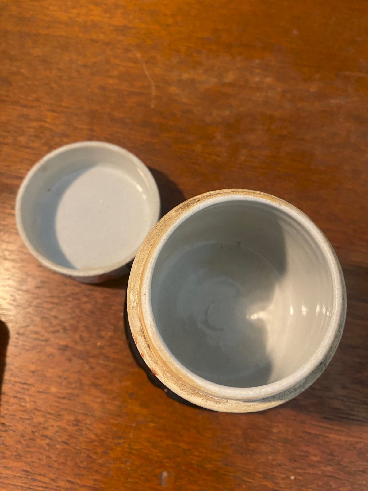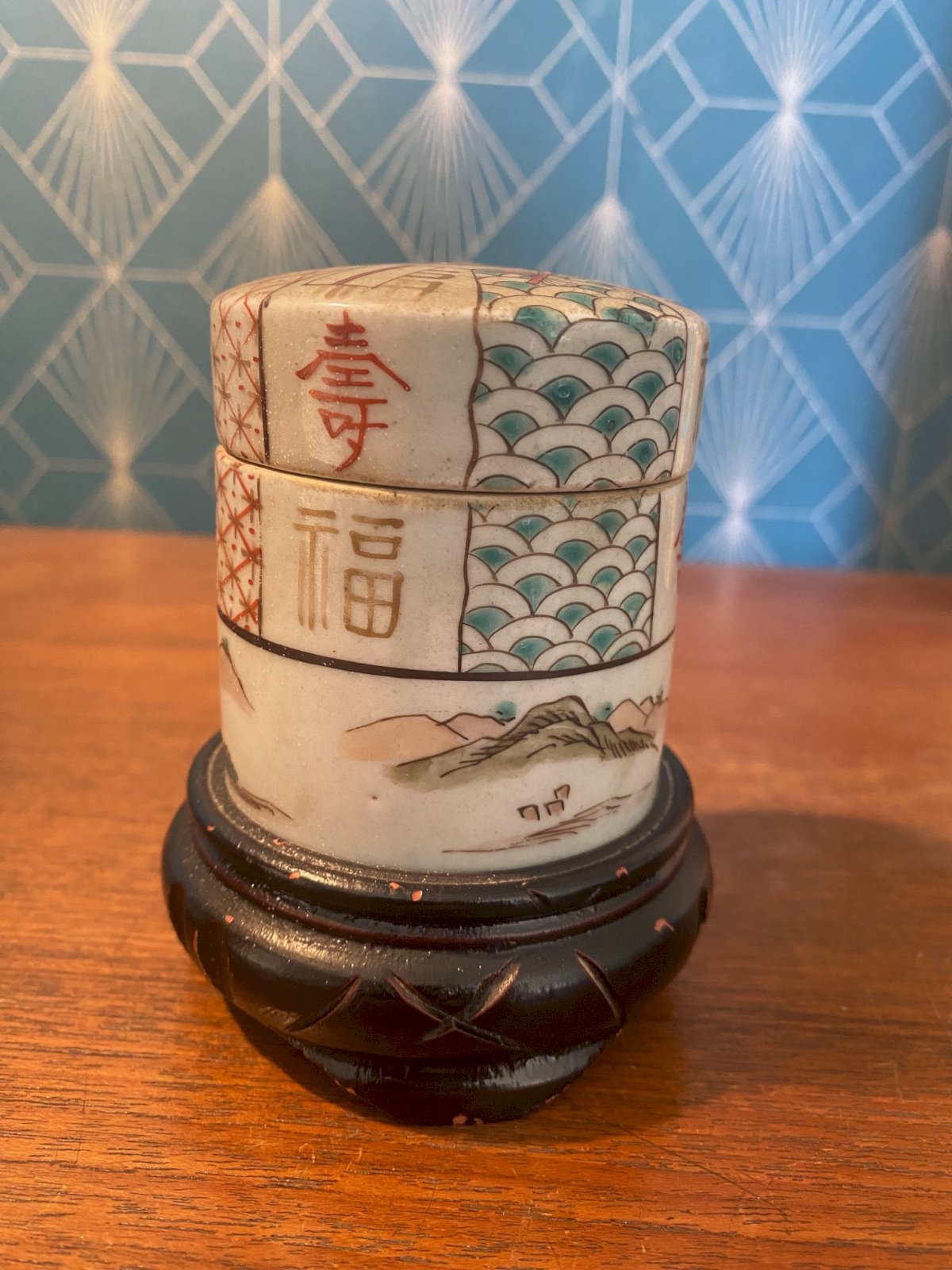 Très jolie boîte de Chine, en porcelaine et forme tube à décor de montagnes, de paysages et de formes géométriques. Boîte à couvert sur son socle en bois noirci elle est en bon état peinte à la main bien sur. Elle mesure 10cm de haut pour 6 de diamètre socle compris, qui ne s'enlève pas.
