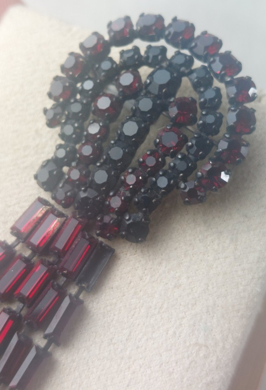 Ancienne broche avec strass rouges pendantes, vintage en bon état, manque un strass rectangulaire non marquée dimensions 8,6 cm X 3,4 cm v oir photos  Consultez mes autres objets  !  réduction des frais de port en cas d'achat groupé État:OccasionObjet ayant été porté. les éventuelles imperfections. Type:Broche Couleur dominante:Rouge