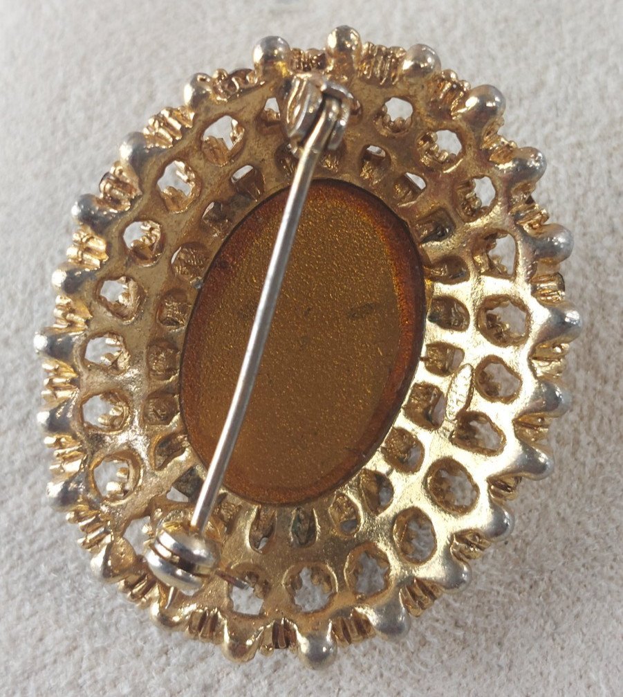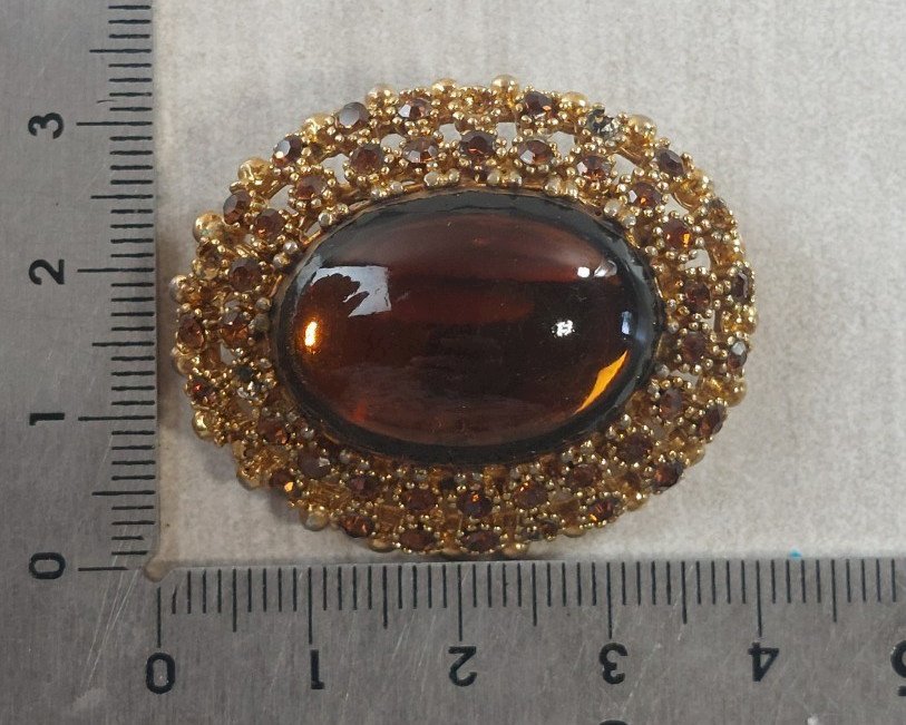 Ancienne broche, cabochon orange et strass, métal doré, vintage