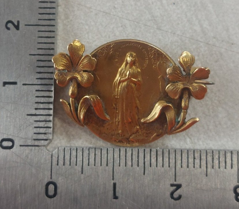 Ancienne broche religieuse, Vierge Marie, en plaqué or FIX, vintage