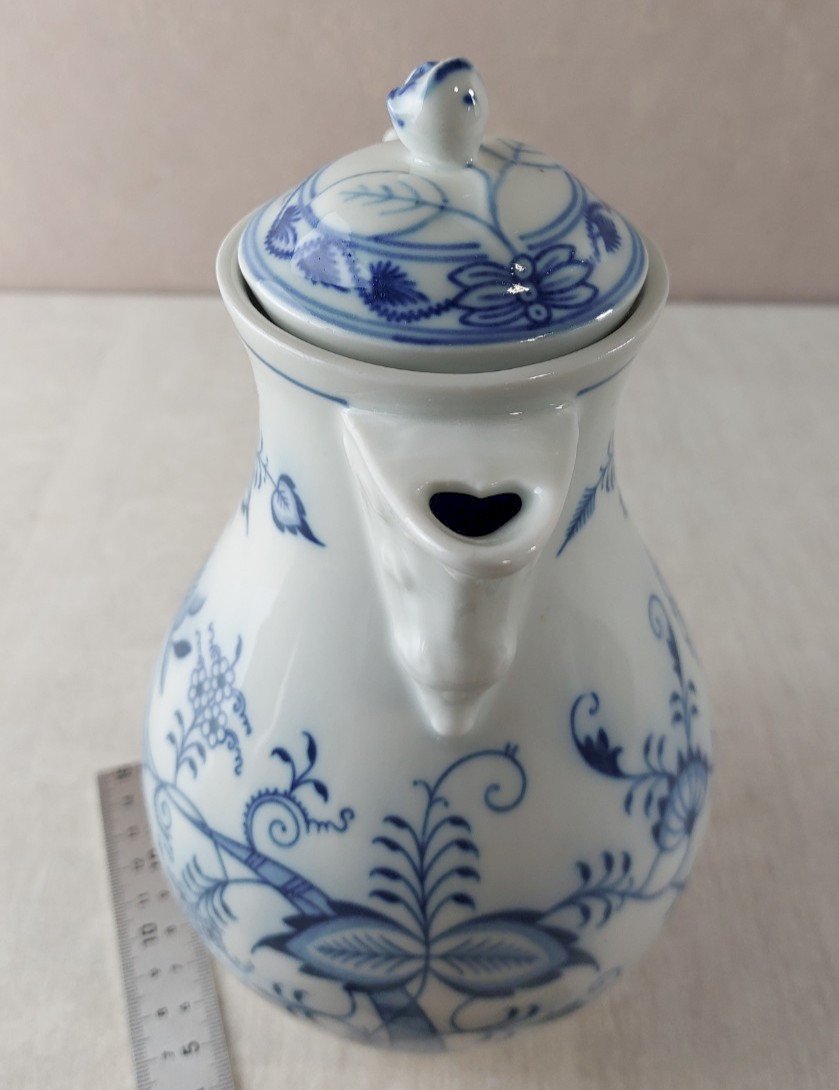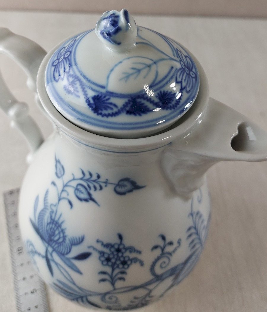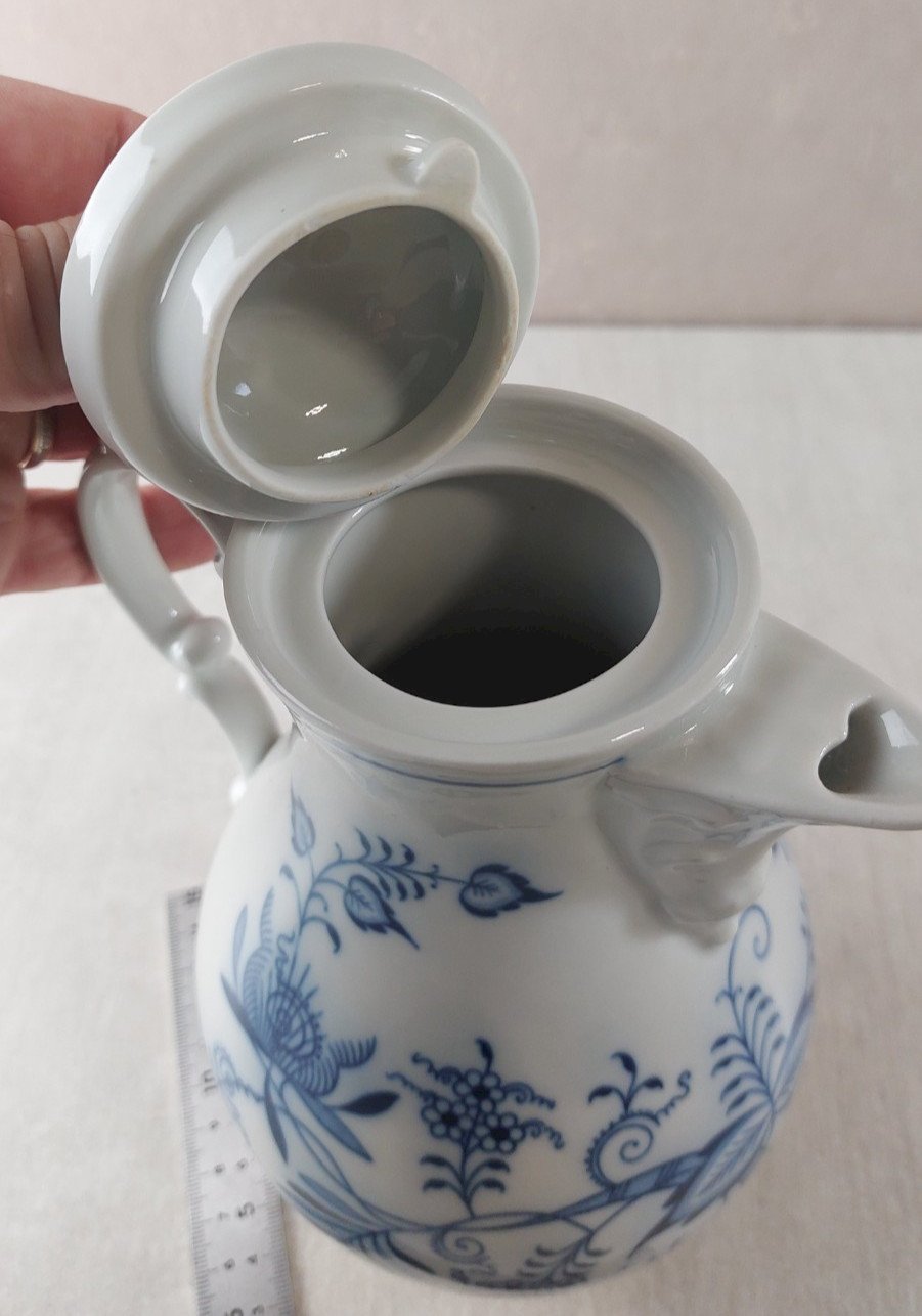 Ancienne moyenne cafetière / théière, décor Blue Onion / fleurs d'oignon / Zwiebelmuster, en porcelaine de Tchécoslovaquie / Czech, style Meissen en bon état, pas de fêle ni d'éclat hauteur 21 cm v oir photos  Consultez mes autres objets  !  réduction des frais de port en cas d'achat groupé