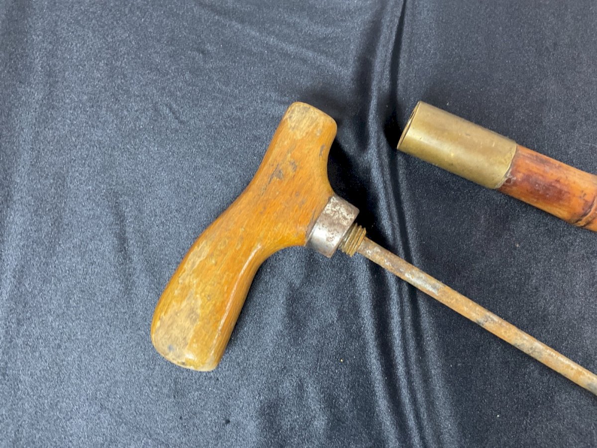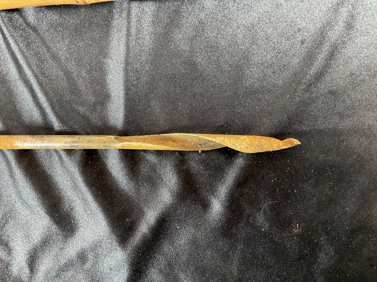 CANNE DE MÉTIER A SYSTEME  Canne à système pour sonder les arbres La poignée qui se dévisse pour laisser apparaître une vrille Longueur : 85,5 cm Authenticité:Original Type:Objet d'art populaire Origine:France Sous-type:Canne Matière:Bois Style:campagne