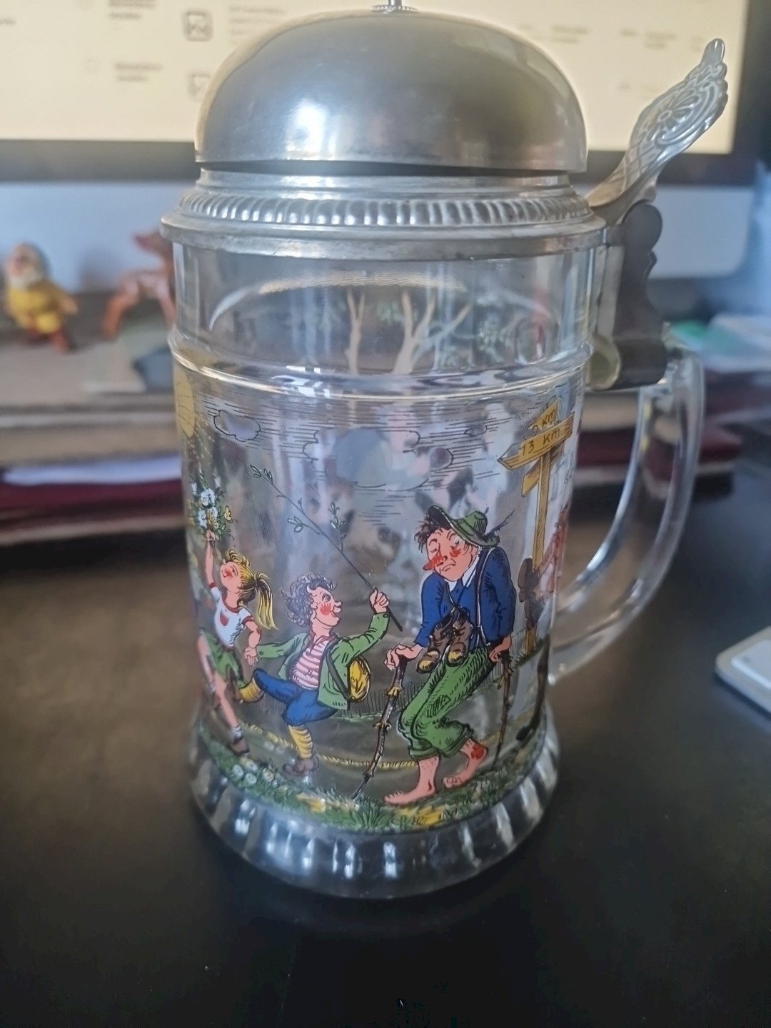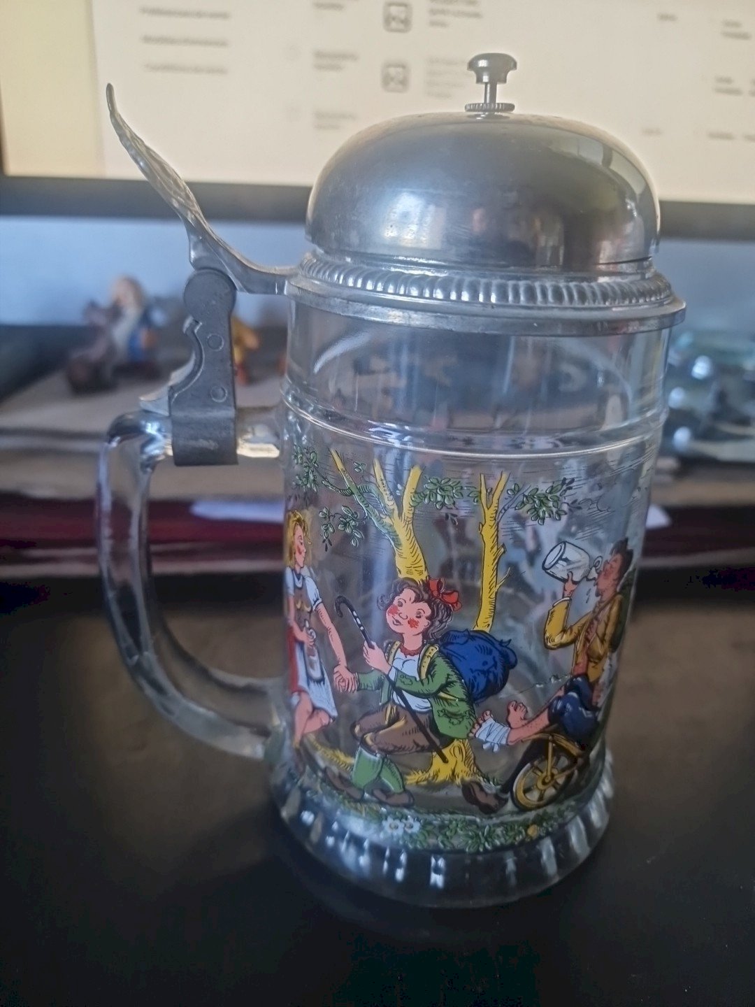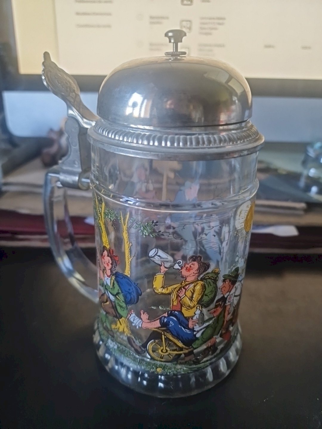 Ancienne chope à bière avec sonnette ou cloche d'hotel avec decor joyeux