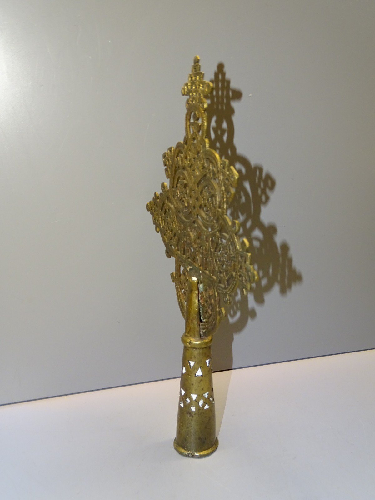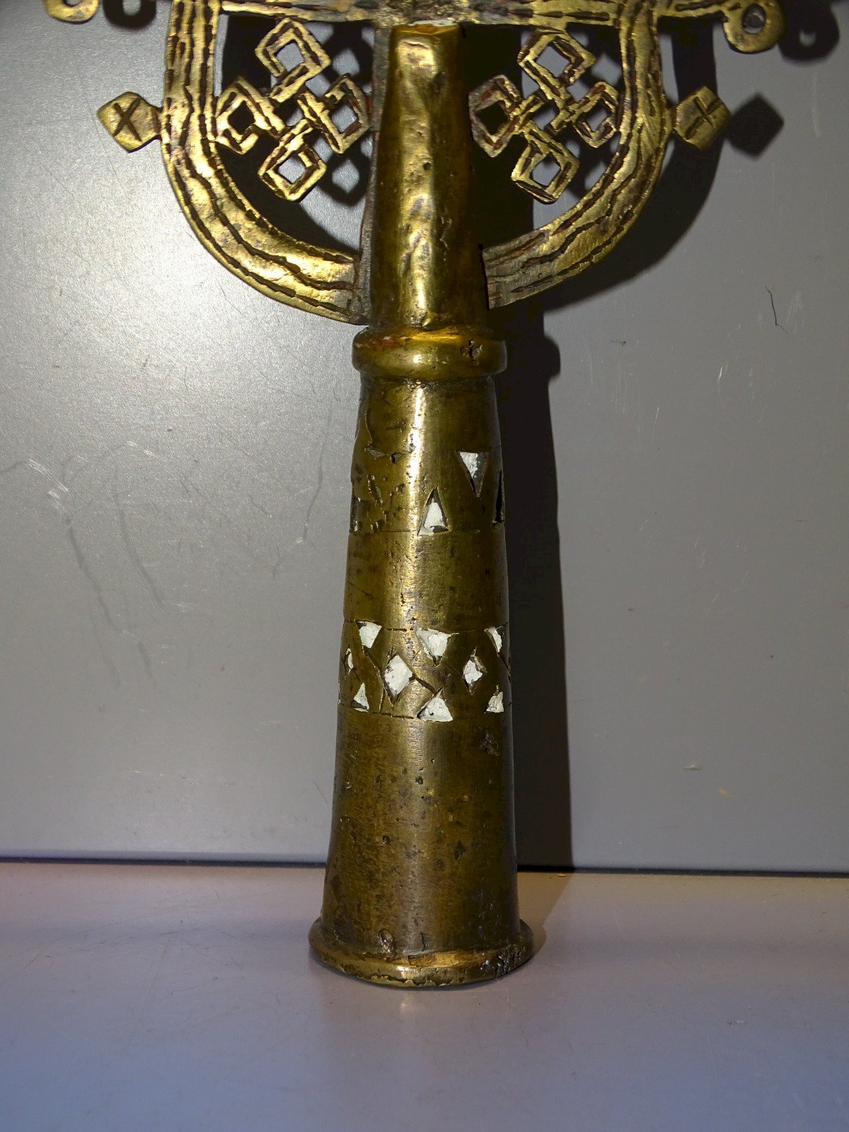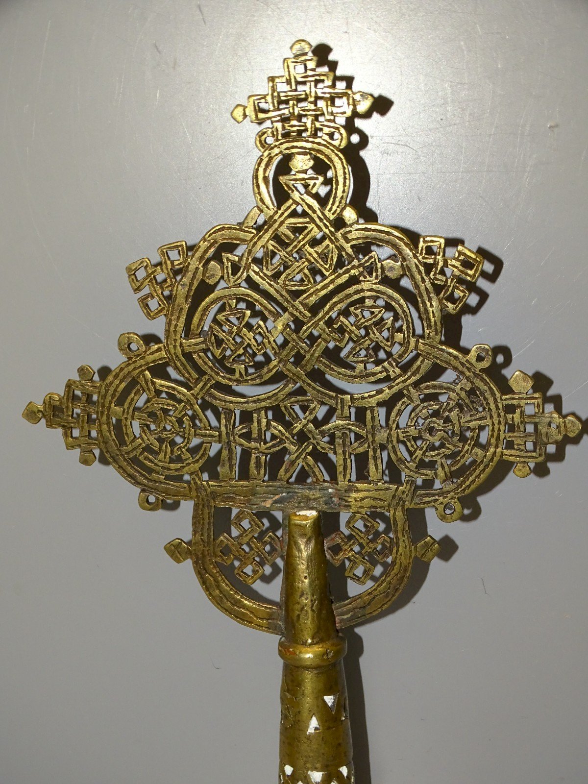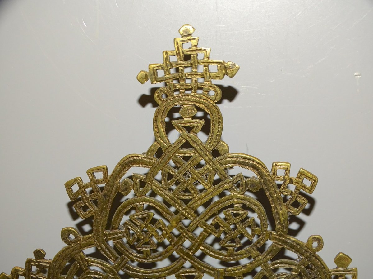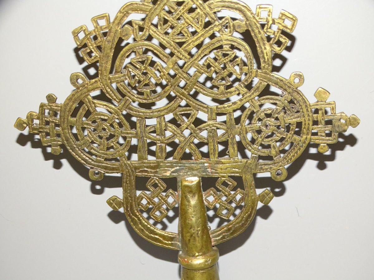 Ancienne croix de procession éthiopienne copte orthodoxe en bronze - 1 petit défaut de fonte sur le haut du support central - avec restes anciens de produit de nettoyage ( voir photos ) - En bon état d'usage - Réf: 1V251219/31  - 30 x 19 cm - Diamètre bas extérieur 3,6 cm et + ou - 2,71 cm intérieur -  Poids 0,477 kg -   Pour toutes questions :  EXPEDITION POSSIBLE EN MONDIAL RELAY ou COLISSIMO sur demande TRES BON EMBALLAGE GARANTI       MERCI de BIEN REGARDER TOUTES les PHOTOS car ELLES FONT PARTIE INTEGRANTE de la DESCRIPTION et PERMETTENT de VOIR l'OBJET AU MIEUX  avec SES PETITS DEFAUTS EVENTUELS - État:Occasion: Objet ayant été utilisé. Consulter la description du vendeur pour avoir plus de détails ...Occasion: Objet ayant été utilisé. les éventuelles imperfections. Type:ORTHODOXE Sous-type:Crucifix, Croix Matière:Bronze