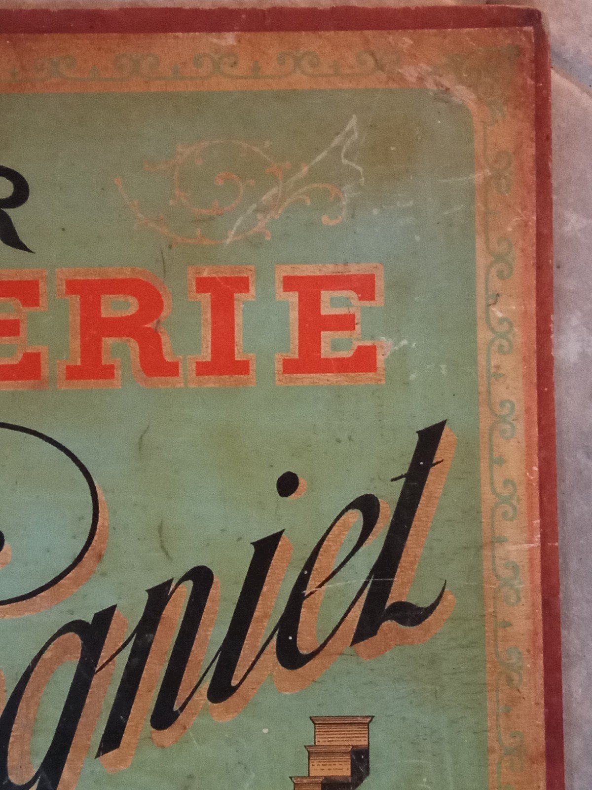 Ancienne Enseigne En carton Atelier de menuiserie Paul Brogniet Brunehamel Aisne Lithographie Matot Braine Reims Dimensions 41 cm x 30.8 cm