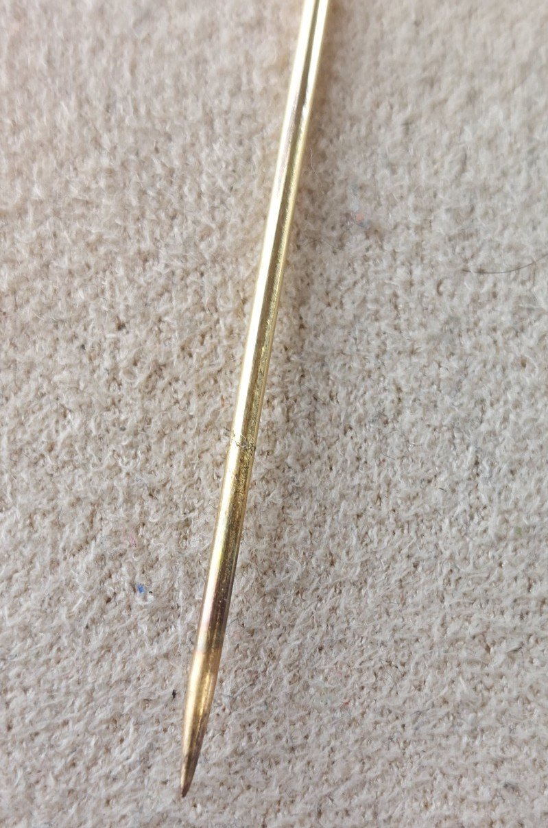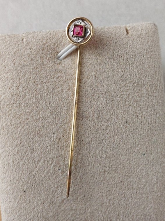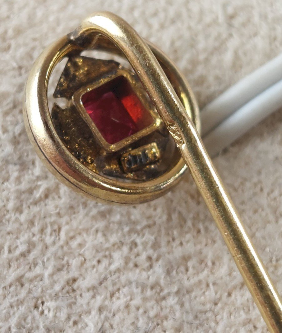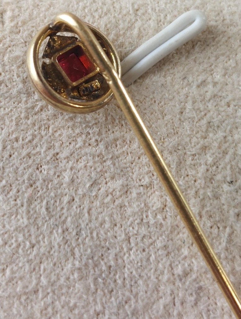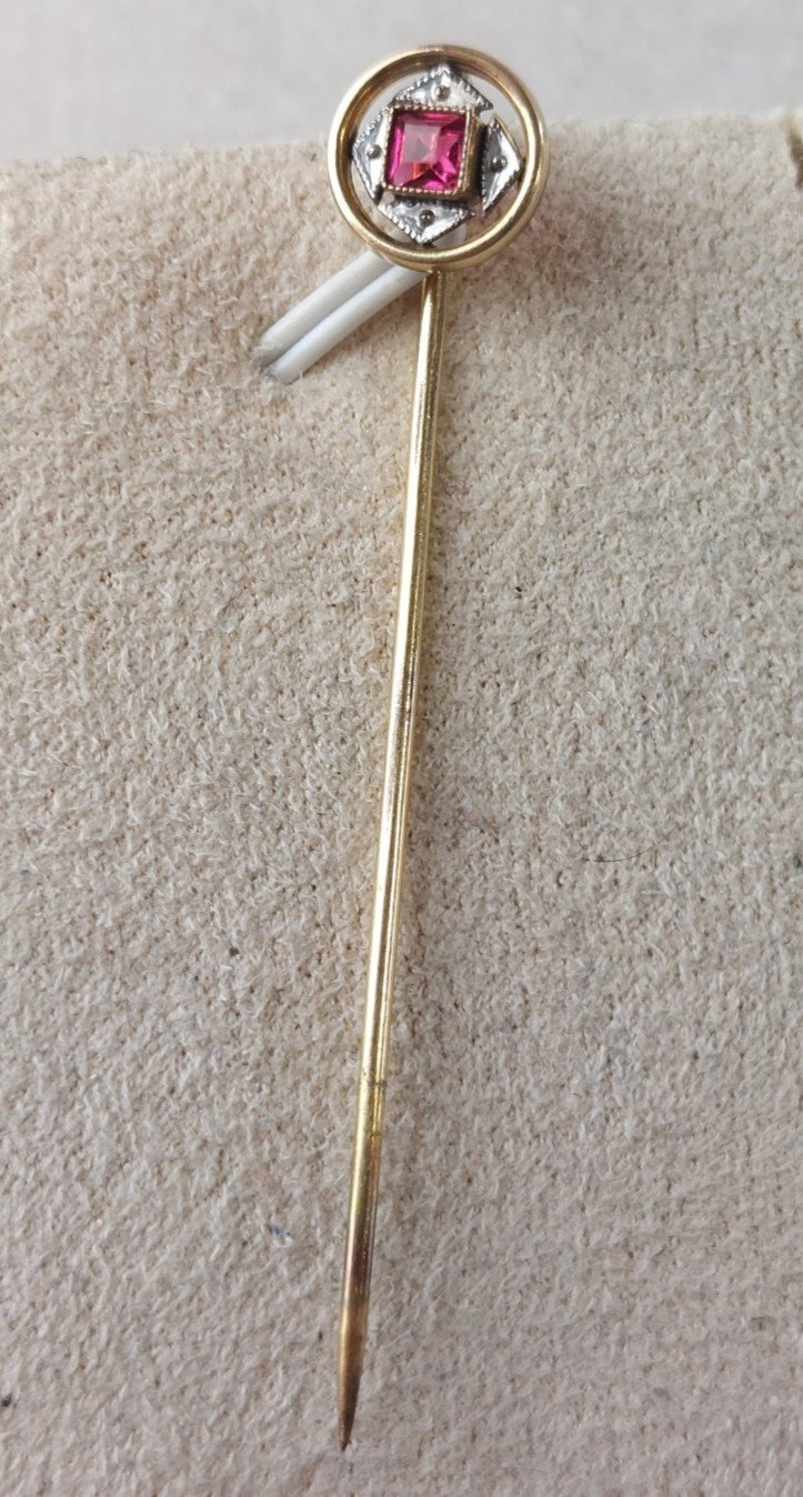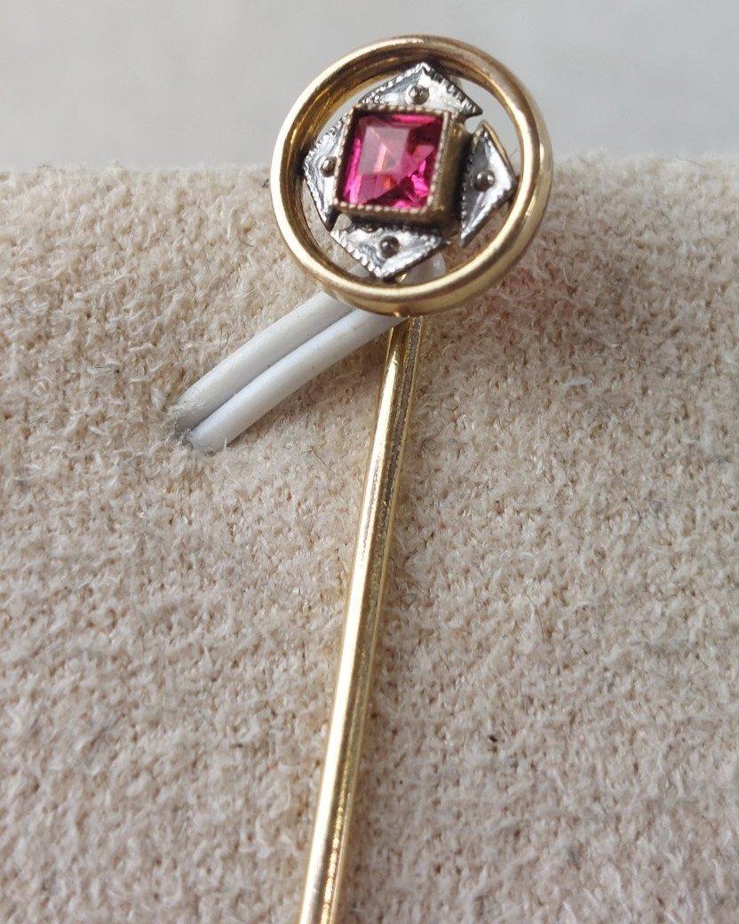 Ancienne épingle à cravate / chapeau, pierre rouge, en plaqué or ^