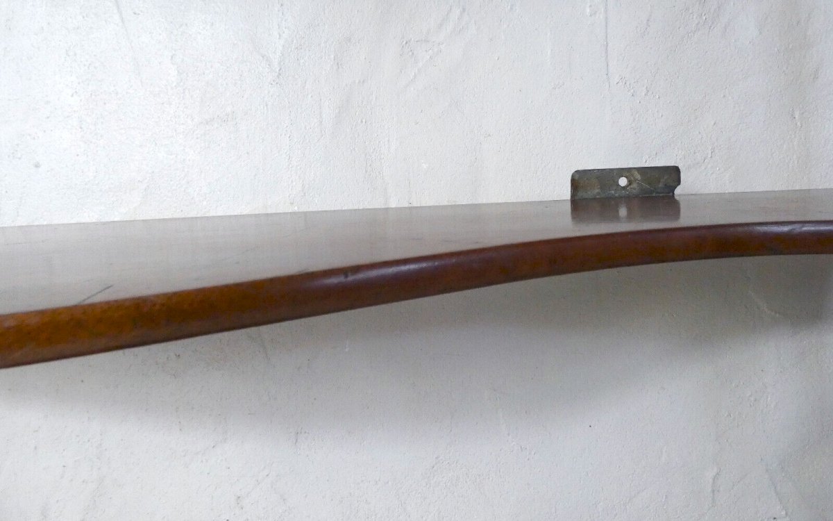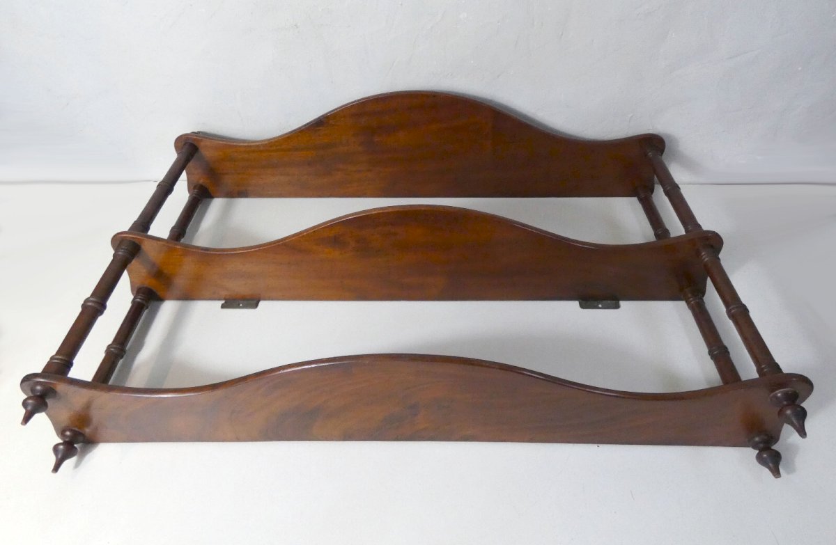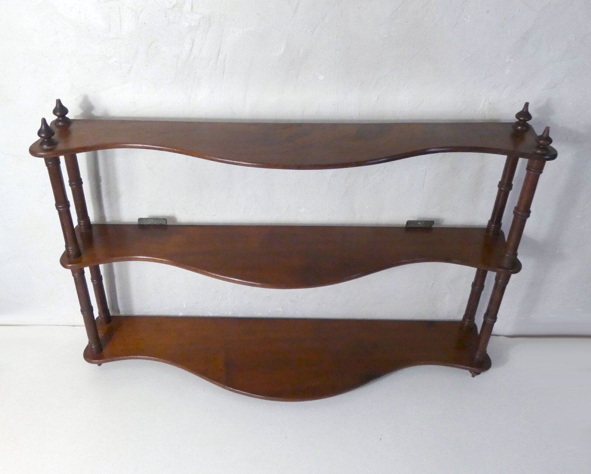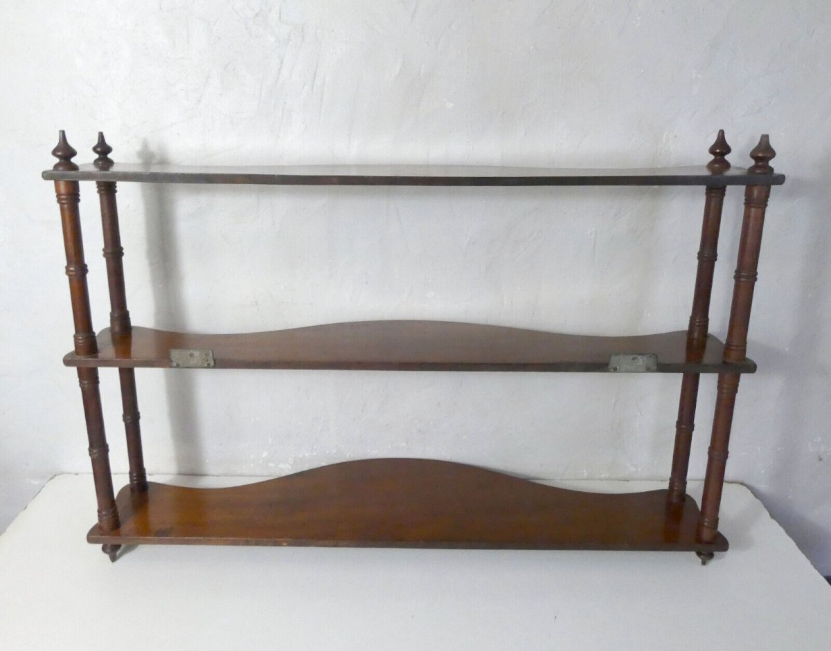 Ancienne étagère murale, en bois massif. Hauteur: 61 cm. Largeur: 89 cm. Profondeur: 17 cm. Hauteurs entre les étagères: 23 et 25,5 cm. Cette étagère est en excellent état, elle est très élégante avec ses étagères courbes et ses montants en bois tourné surmontés de toupies.