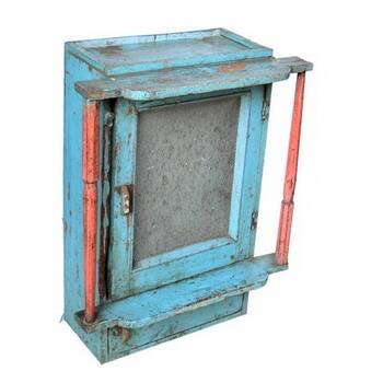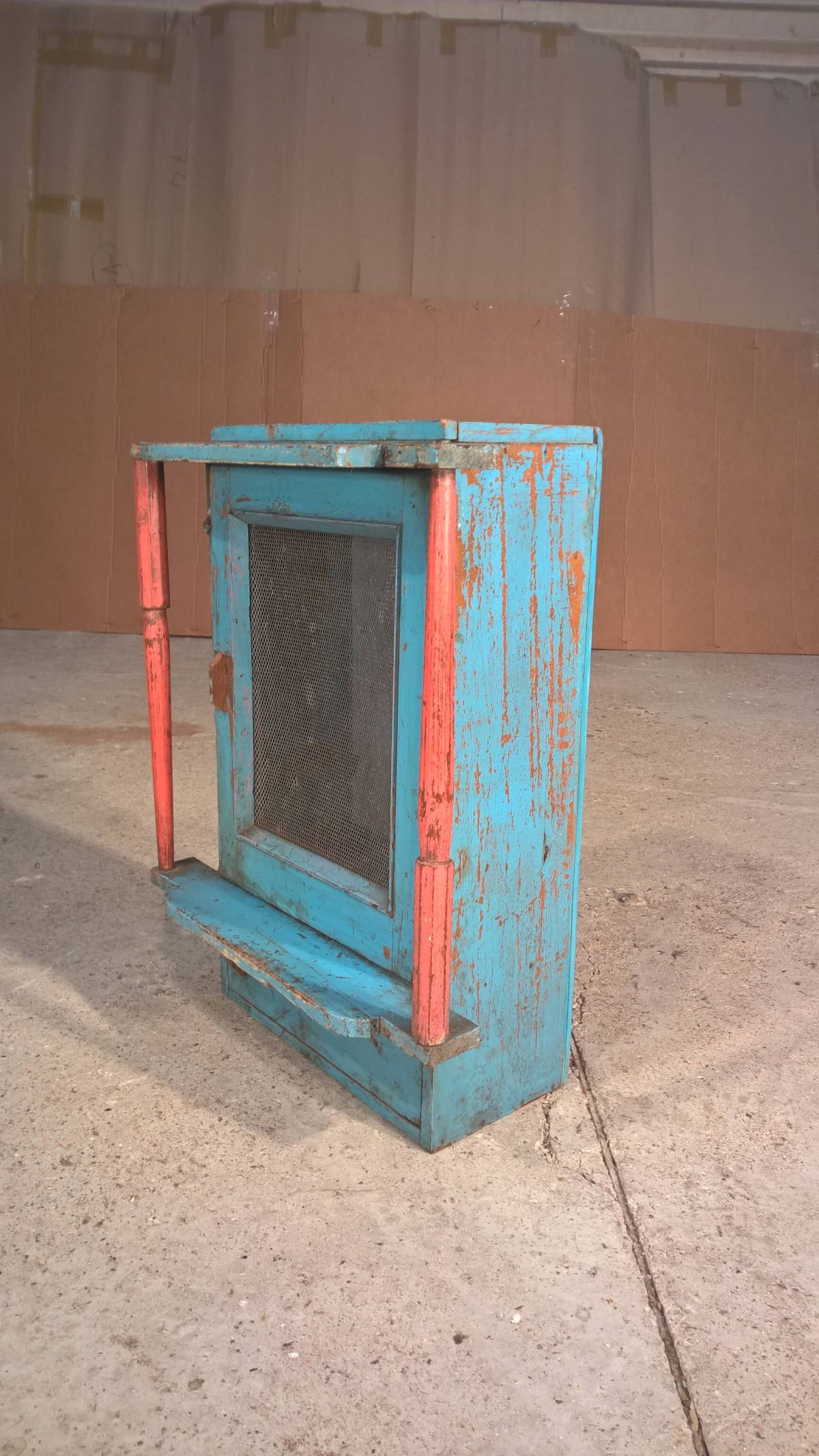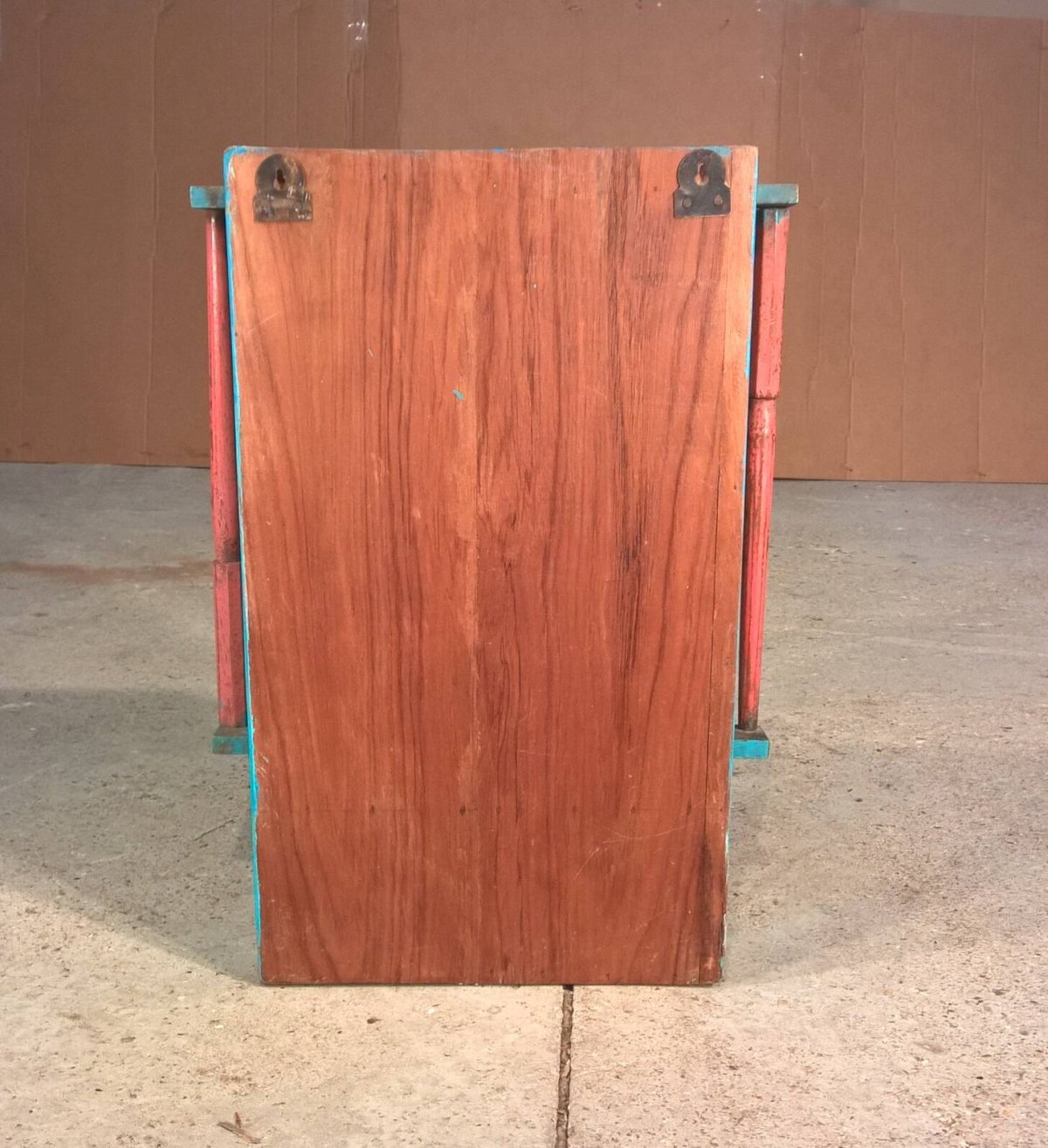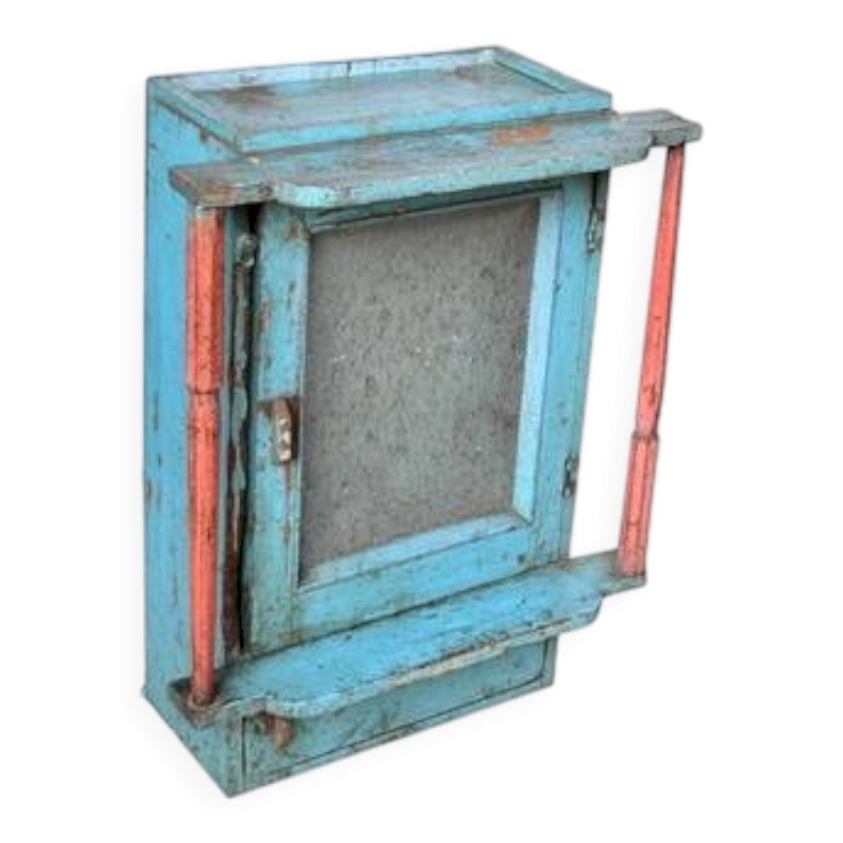 Ancienne étagère murale / 1 porte vitrée + 1 porte clapet en tek birman /patine turquoise et rose d'origine / 40 x 22 x 52 cm - 6 kg - prof int 12 cm - haut int de H en B: 25 -9 cm