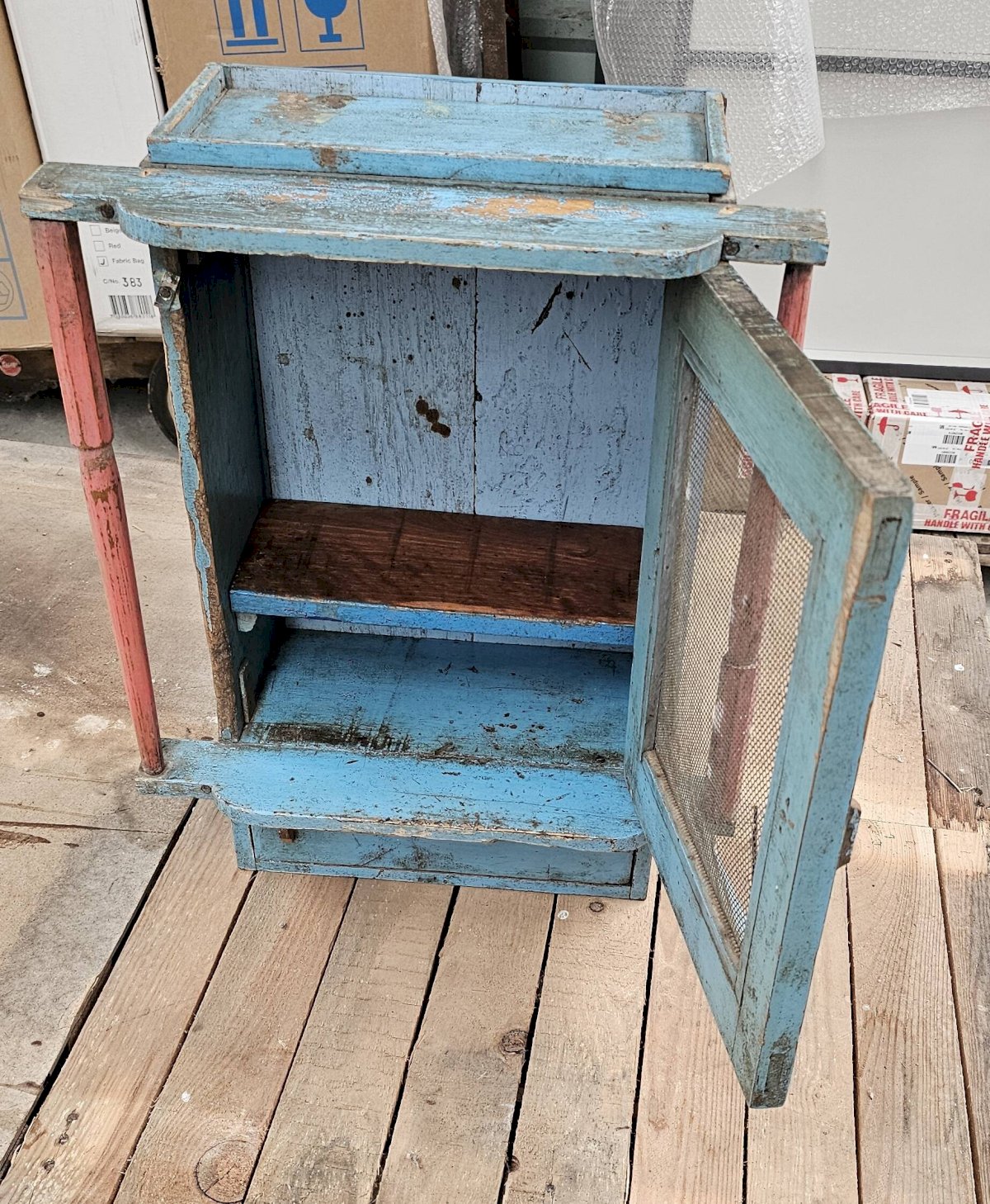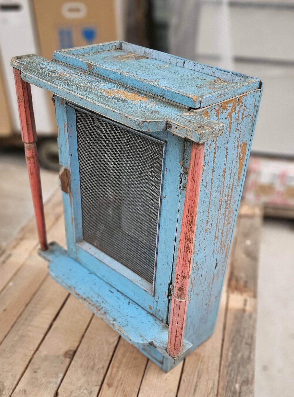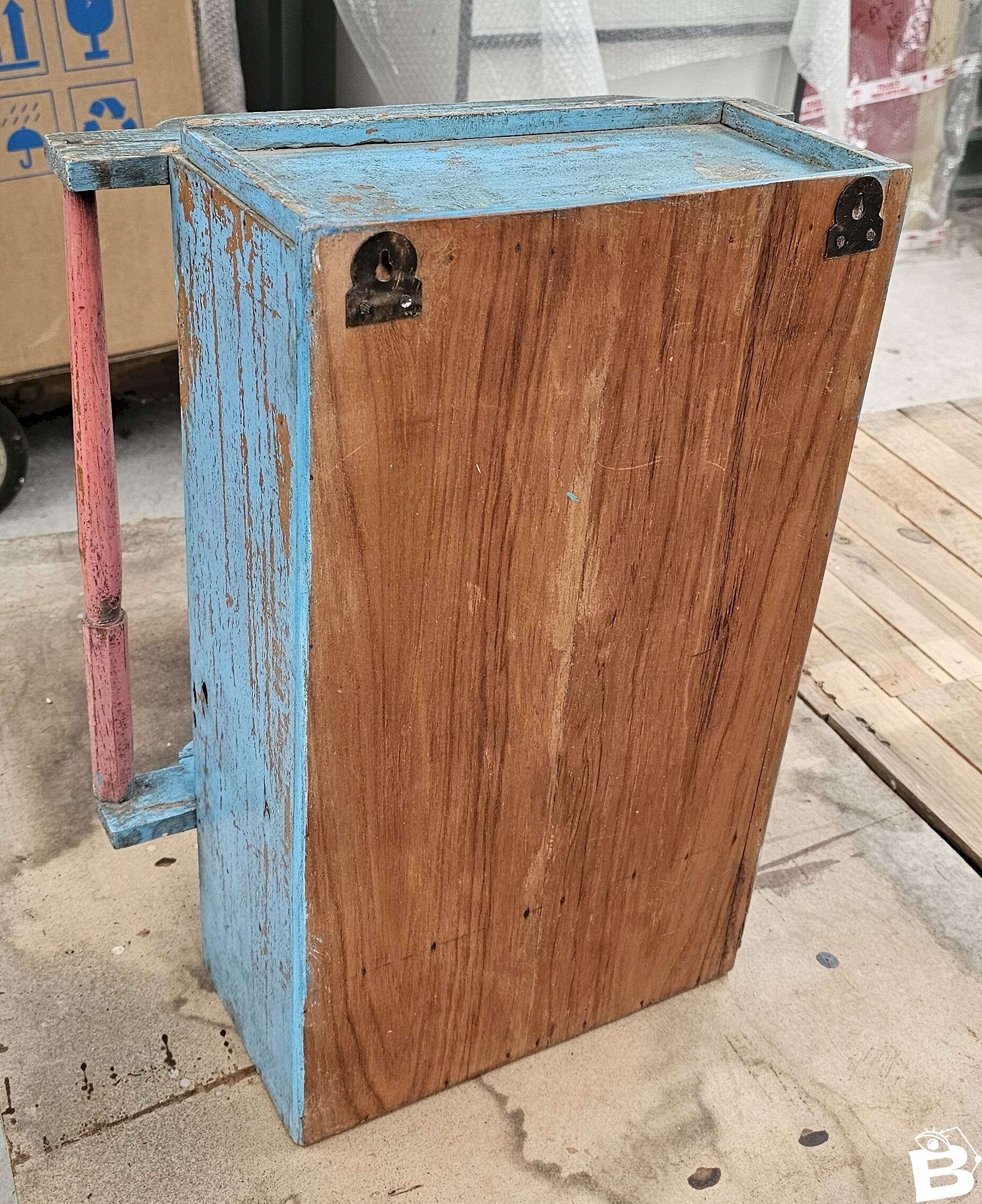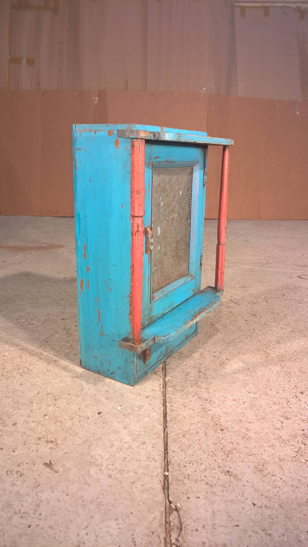 Ancienne étagère murale / 1 porte vitrée + 1 porte clapet en tek birman /patine turquoise et rose d'origine / 40 x 22 x 52 cm - 6 kg - prof int 12 cm - haut int de H en B: 25 -9 cm
