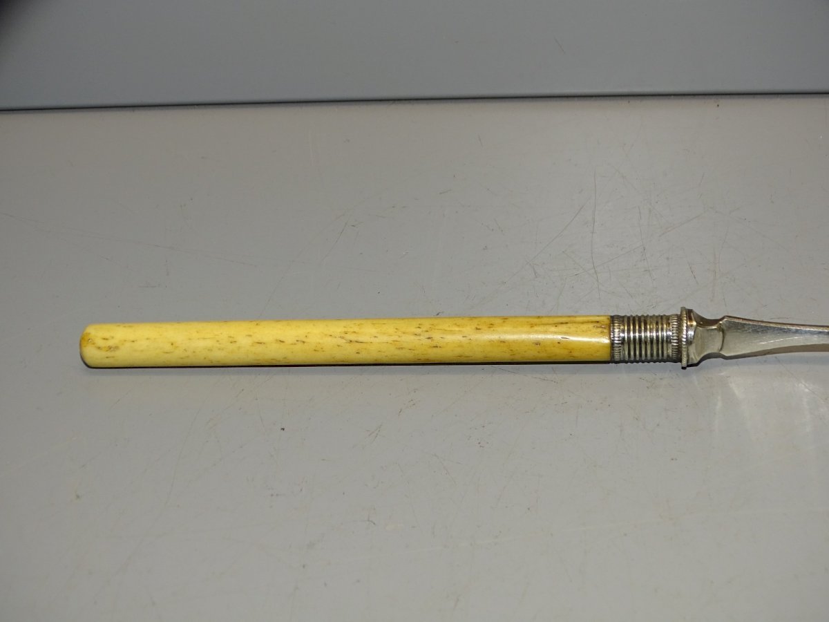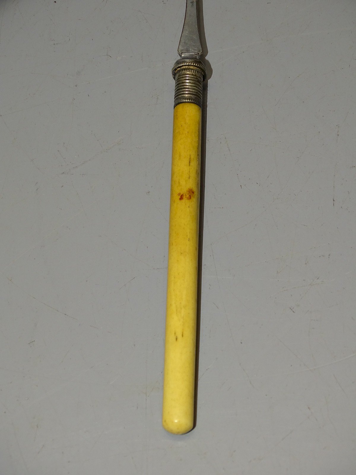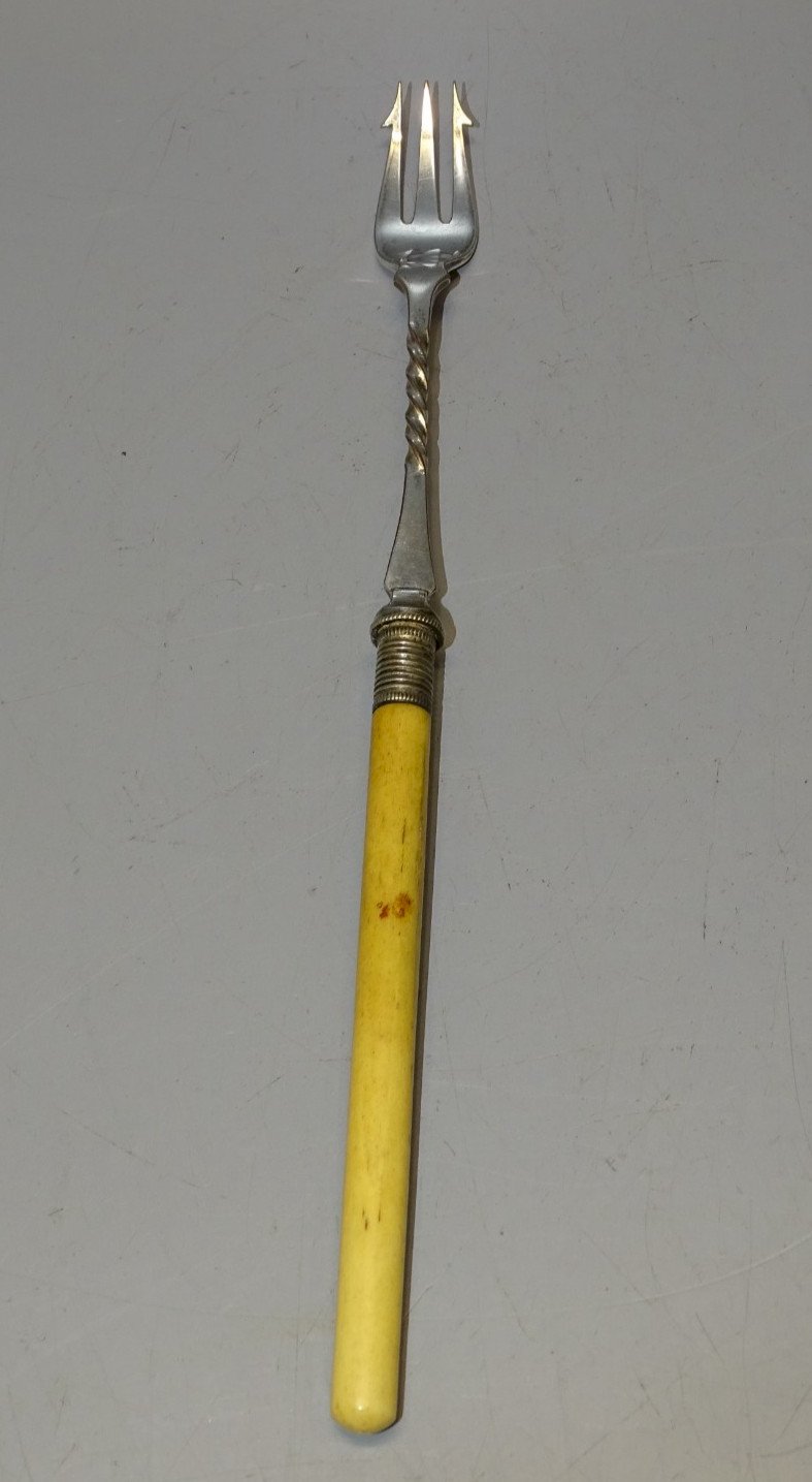 Belle ancienne fourchette à cornichons Métal argenté avec un joli manche lisse avec 3 dents - présence de traces sur le manche et un petit début de fêle ( voir photos ) - En bel état d'usage - Réf: 1V251205/9  - Longueur 21,6  cm -  Poids 27 g -   Pour toutes questions :  EXPEDITION POSSIBLE EN MONDIAL RELAY ou COLISSIMO sur demande TRES BON EMBALLAGE GARANTI       MERCI de BIEN REGARDER TOUTES les PHOTOS car ELLES FONT PARTIE INTEGRANTE de la DESCRIPTION et PERMETTENT de VOIR l'OBJET AU MIEUX  avec SES PETITS DEFAUTS EVENTUELS - État:Occasion: Objet ayant été utilisé. Consulter la description du vendeur pour avoir plus de détails ...Occasion: Objet ayant été utilisé. les éventuelles imperfections.