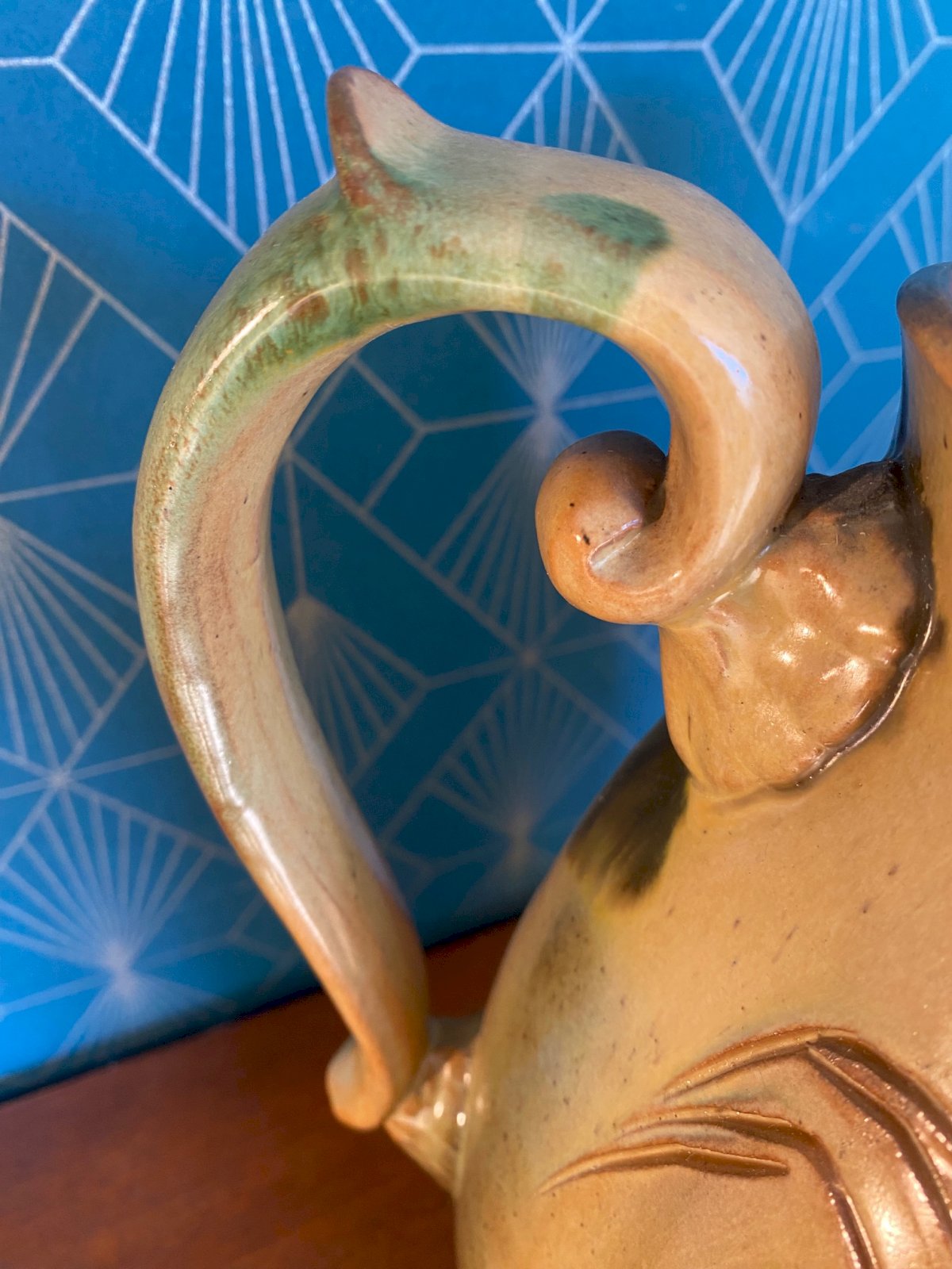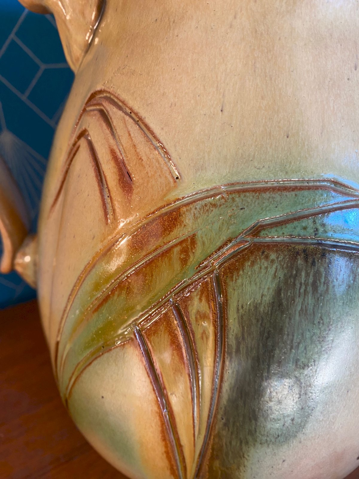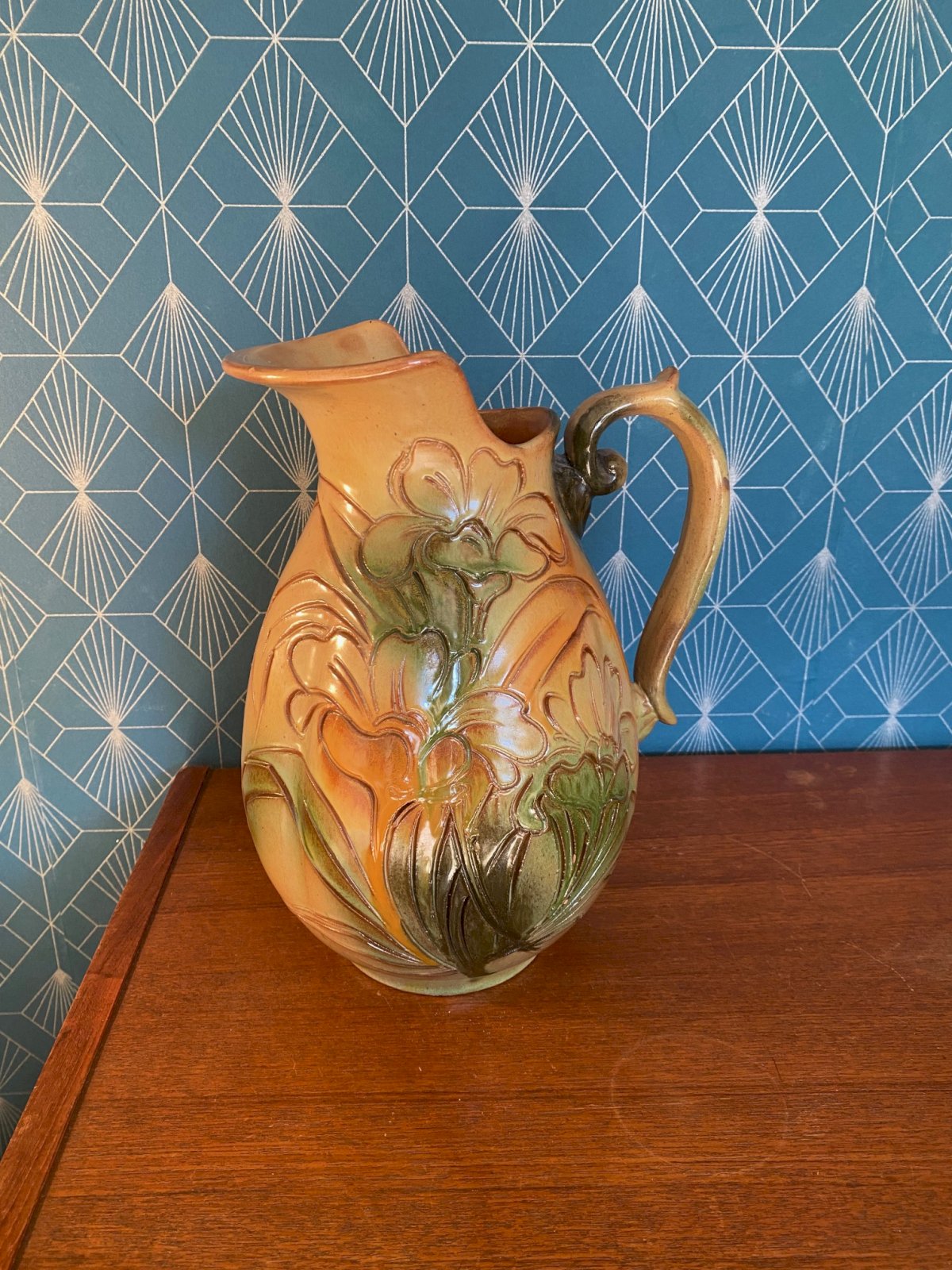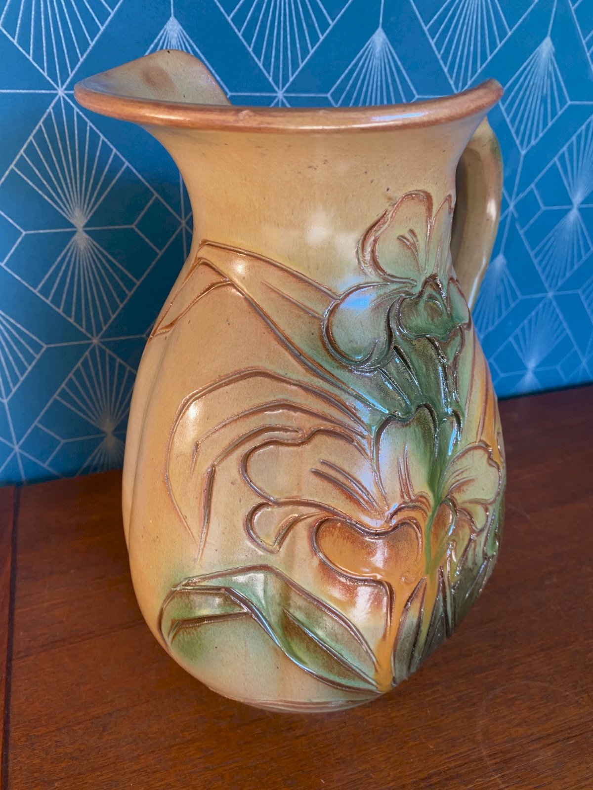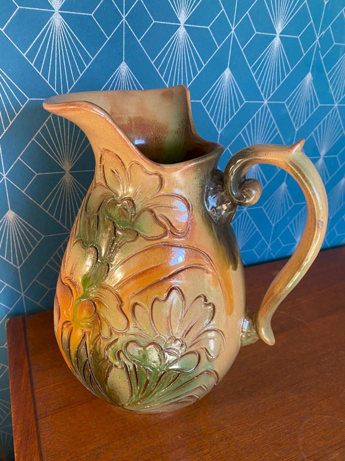 Superbe et grande cruche ou verseuse, ou carafe, en terre cuite émaillée, la panse à décor ciselé de fleurs et la prise en enroulement. Ecole de Romacréa, groupement d'artiste devenu fabrique puis école d'art en 1950 à Rome. Pièce unique. Elle mesure 29cm de haut.