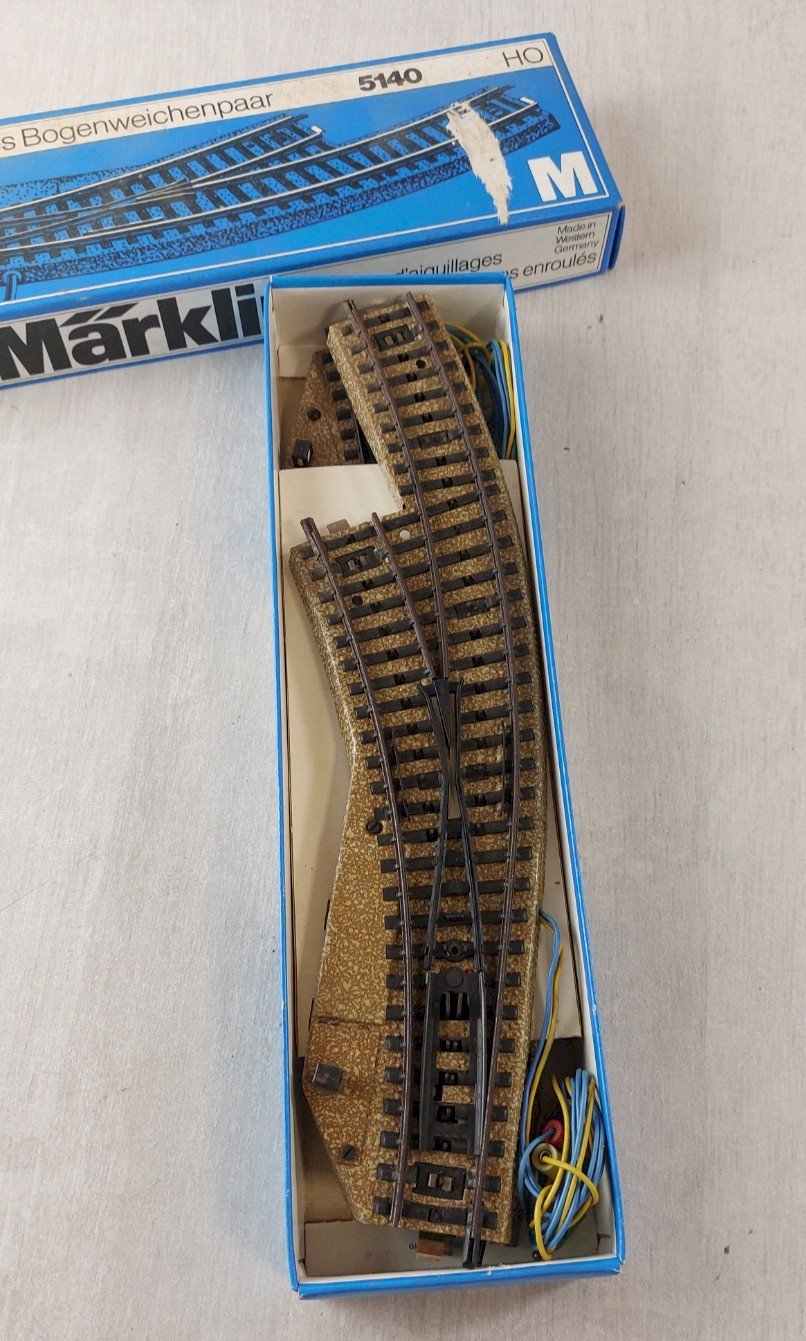 Ancienne paire d'aiguillages électromagnétiques enroulés, Märklin 5140, en HO en bon état, quelques traces d'oxydation sur les rails avec boîte (quelques usures) v oir photos  Consultez mes autres objets  !  réduction des frais de port en cas d'achat groupé État:OccasionObjet ayant été utilisé. les éventuelles imperfections. Marque:Märklin Type de voie:Voie M Forme de la voie:Courbe Numéro de pièce fabricant:5140