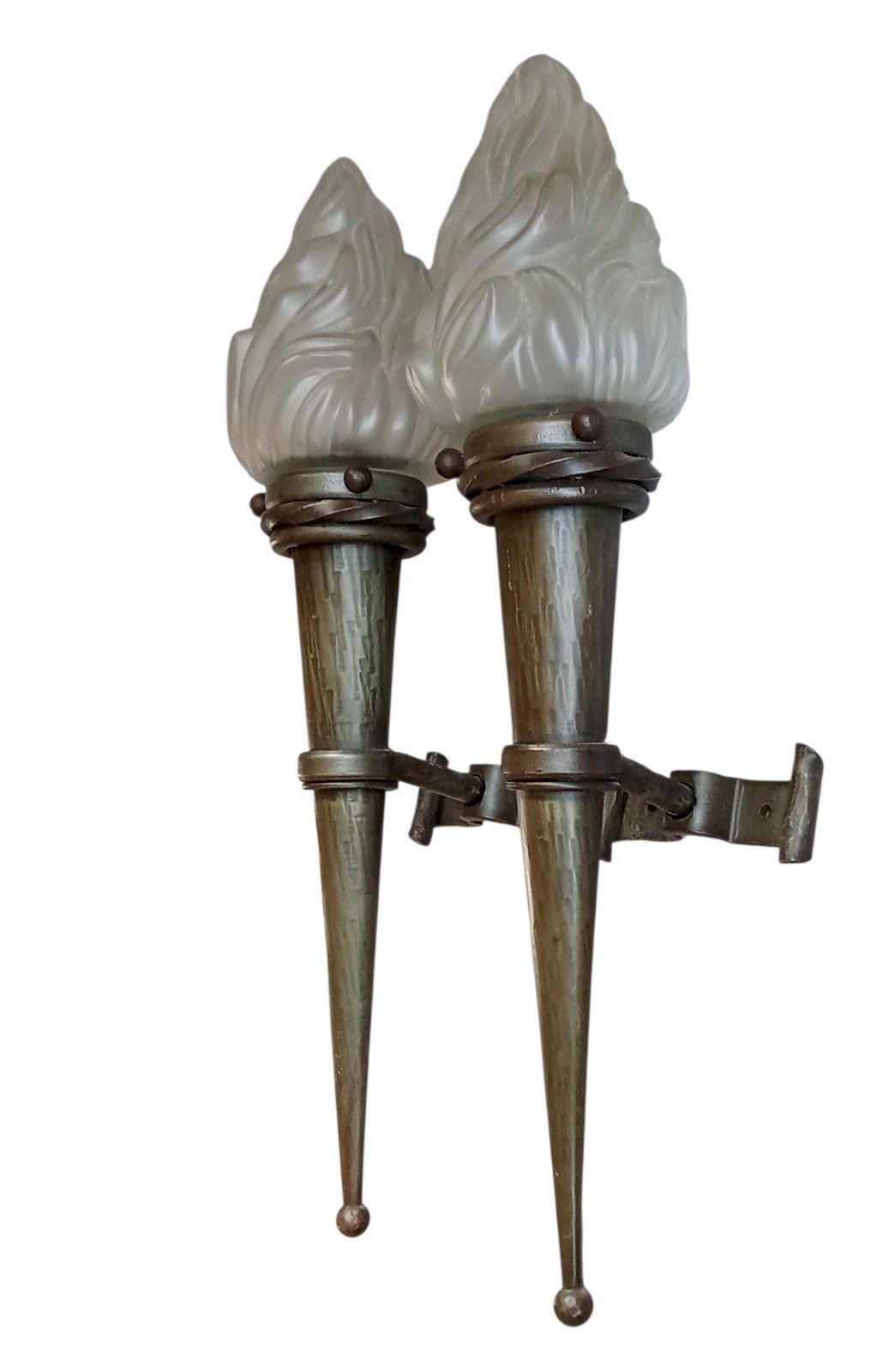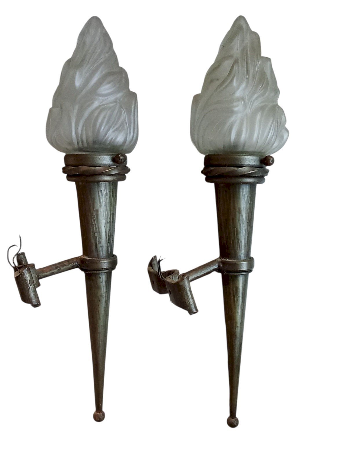 Ancienne Paire de Grandes Appliques Murales Torchères/ Lanterne/Flambeaux En Fer Globes en Verre Très déco Bel état Hauteur totale 62 cm Hauteur globe flamme 19.5 cm Largeur 12.7 cm Profondeur 19 cm Type:Applique Matière:Fer