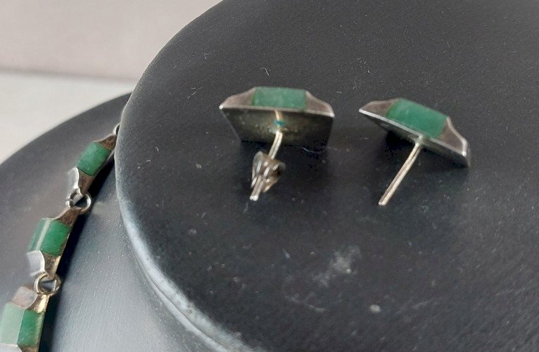 Ancienne parure, collier + boucles d'oreilles, agate, en argent massif, Taxco