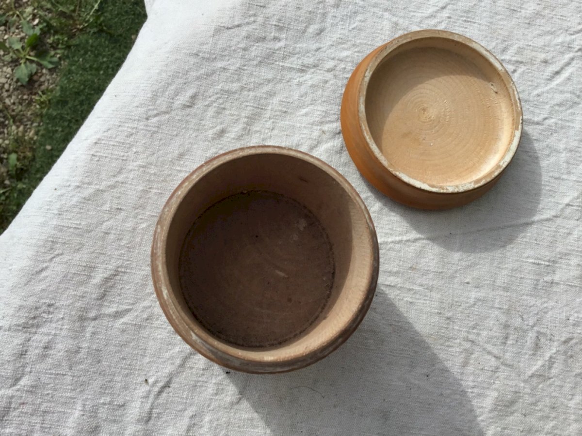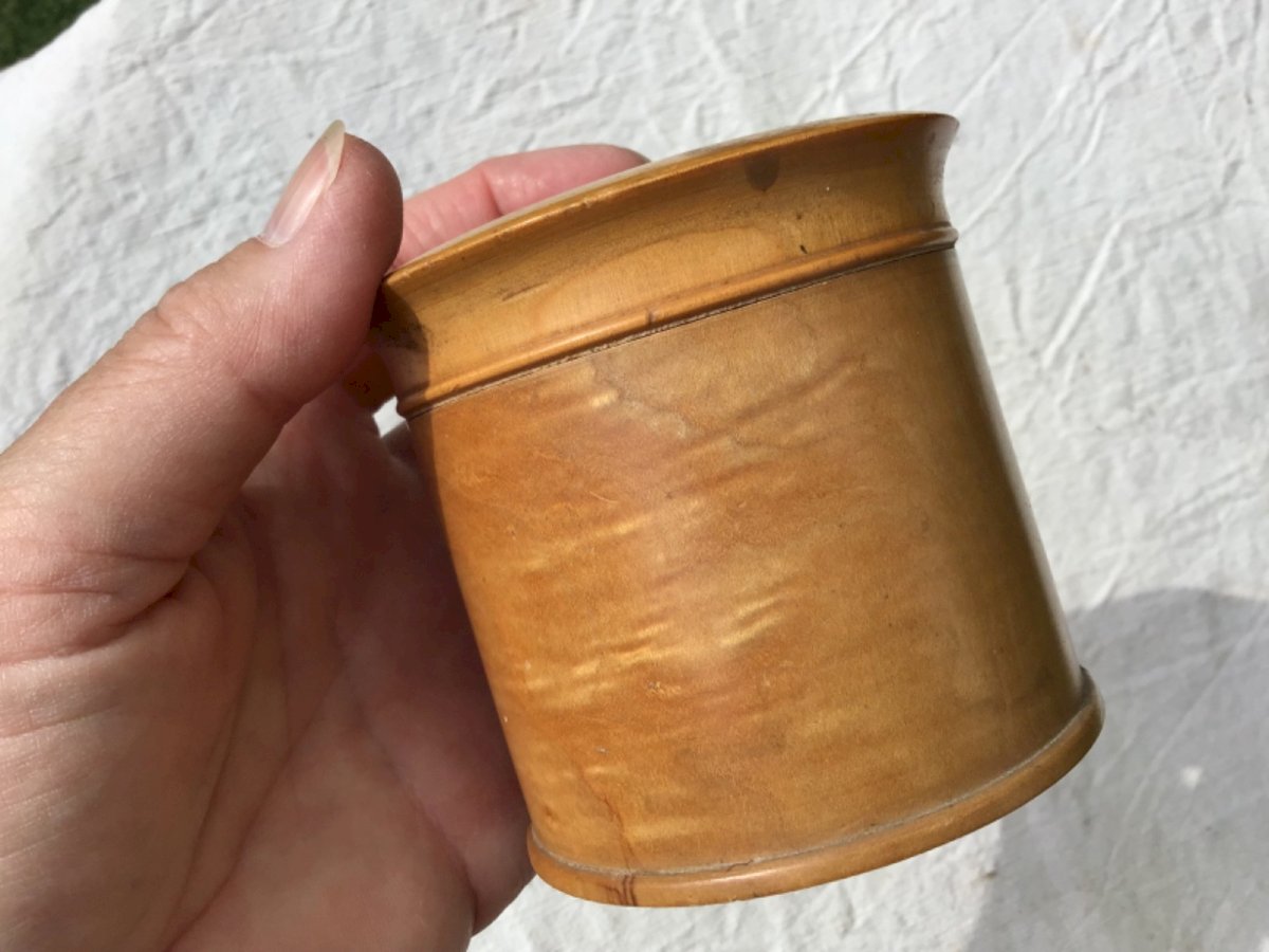 Ancienne petite boîte ronde en bois tourné buis  Avec décor peint huile d’un chalet de montagne  Quelques traces du temps  Diamètre: 8 cm cm Hauteur: 7 cm Authenticité:Original Type:Objet de vitrine, Décoratif Période:Design du XXème Origine:France Sous-type:Boîte Matière:Bois Style:boîte à bijoux