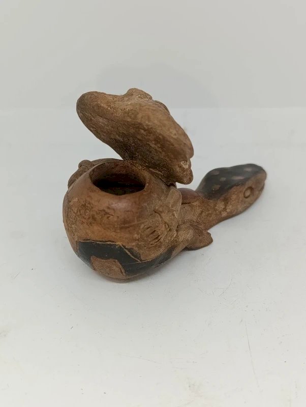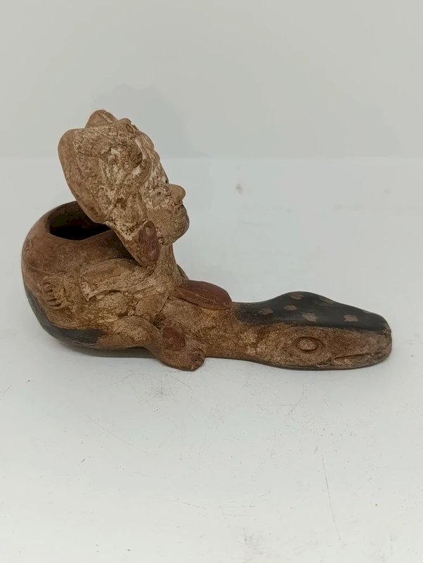 ancienne pipe sud americaine maya, azteque? en bon etat en terre cuite quelques petites marques d'usures normales du a son age epoque à definir longueur 11.5cm...
