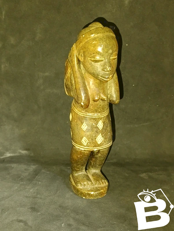 ancienne sculpture en pierre d'origine africain , gabon? en bon etat en forme de femme avec panier dans le dos quelques petites egrenures (voir photos) hauteur 22cm