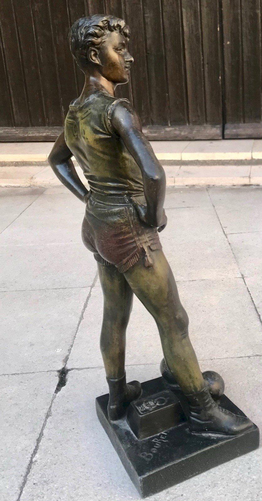 Statuette d'Haltérophile Fin XIXe Siècle signée Bouret Cette magnifique sculpture, représentant un Jeune Haltérophile ou Haltérophile au repos, est une œuvre emblématique du sculpteur français Eutrope Bouret né en 1833 et décédé en 1906. Bouret a exposé au Salon de Paris et est reconnu pour ses sujets figuratifs de la fin du XIXe siècle. La statue est réalisée en régule (alliage à base d'étain) et présente une très belle patine d'origine. Elle est en bon état général et repose sur un socle d'origine. La signature Bouret est clairement apposée sur le socle, garantissant son authenticité. Il s'agit d'une pièce d'époque, parfaite pour les collectionneurs d'art statuaire du XIXe siècle. Dimensions et Poids : Hauteur totale environ 45 cms. Dimensions du socle environ 14.5x14.5 cms. Poids environ 4100 grs. Authenticité:Original Type:Sculpture Poids:4 kg 100 Période:XIXème et avant Pays d'origine:France Hauteur:45 cm environ Matière:Régule Caractéristiques:Signée Thème:Sport
